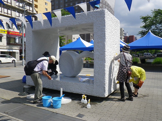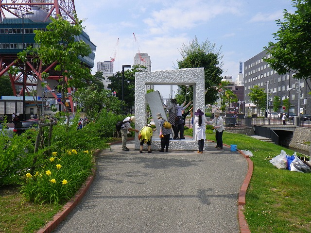 7月の暑い中、彫刻清掃ボランティア「創成川ポポロ」の皆さんが、安田侃三の彫刻清掃に励みました。