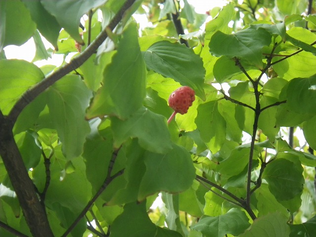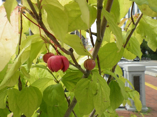 公園の、ヒメリンゴや、ヤマボウシ、キタコブシの実、そしてツリバナも、赤くなってきました。