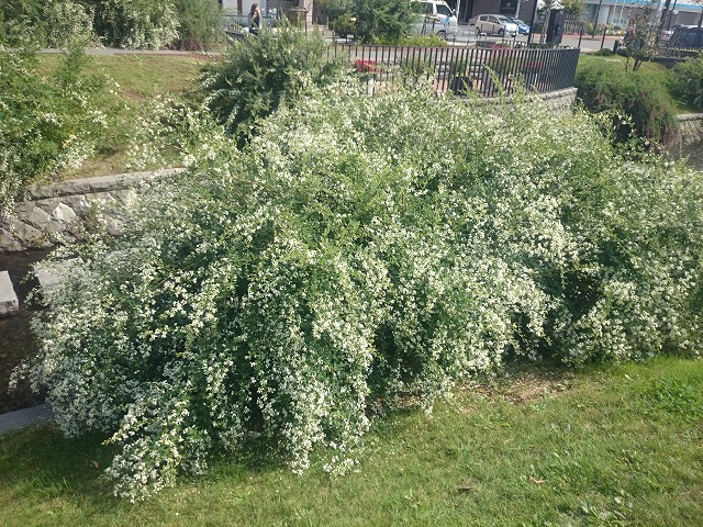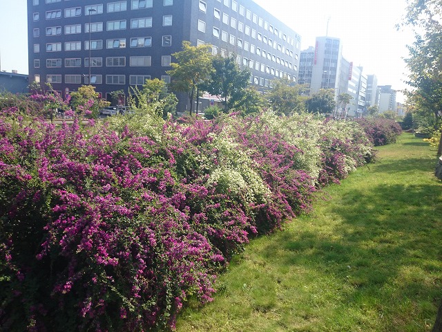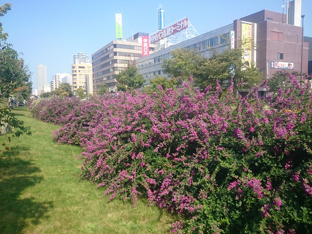 創成川公園内には、ミヤギノハギやシラハギが植えられています。 公園の北の方のブロックでは、そろそろ見ごろを迎えます。 垂れ下がっているのがミヤギノハギ、そしてまだ花はほとんど咲いていませんが立っているのがシラハギです。 ミヤギノハギには、赤紫と白花の物があります。 ミヤギノハギは葉が細長く先がとがっているのですが、垂れ下がっていて葉が丸いのは、園芸品種であるミヤギノハギのもととなるケハギだということです。 秋の七草にも登場する「ハギ」の花はまだしばらく楽しめます。