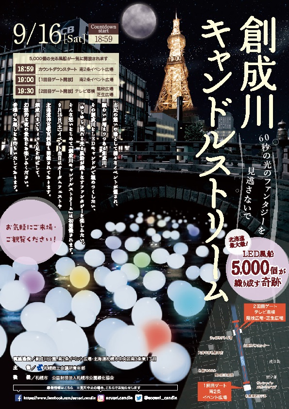創成川公園のまん中を流れる「創成川」で、9月16日土曜日に、光る風船5000個で川を埋め尽くす「創成川キャンドルストリーム」が開催されます。 18時59分にカウントダウンが開始され、19時ちょうどに、5000個のLED入りの光る風船が、狸二条広場の北側から一気に流されます。 光のファンタジーをお楽しみ下さい。