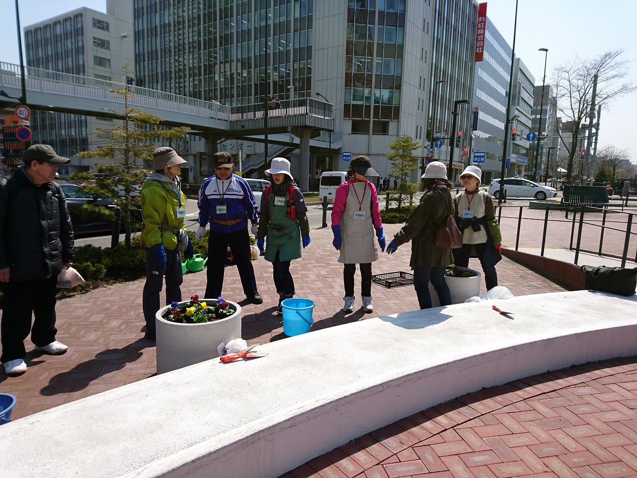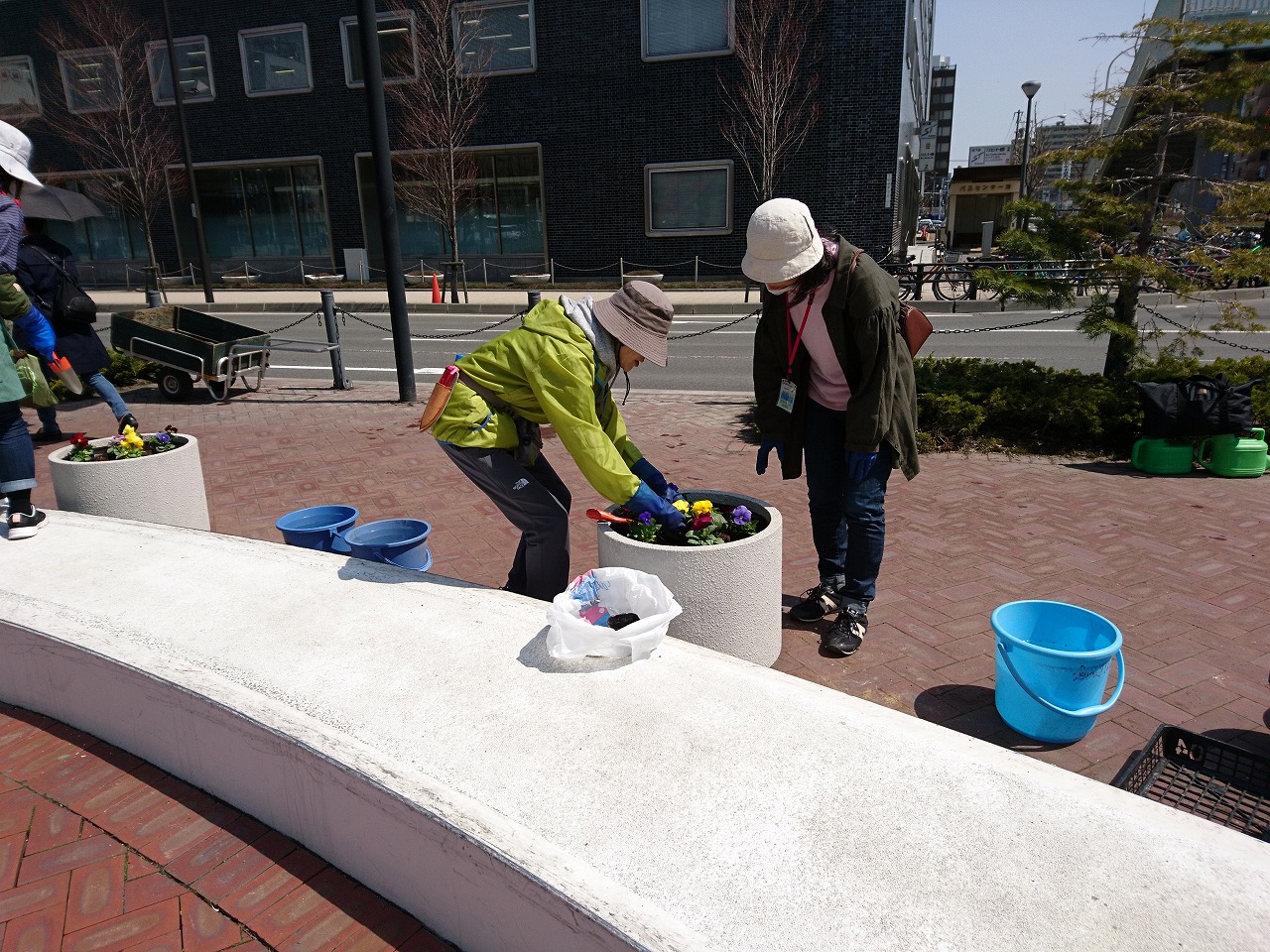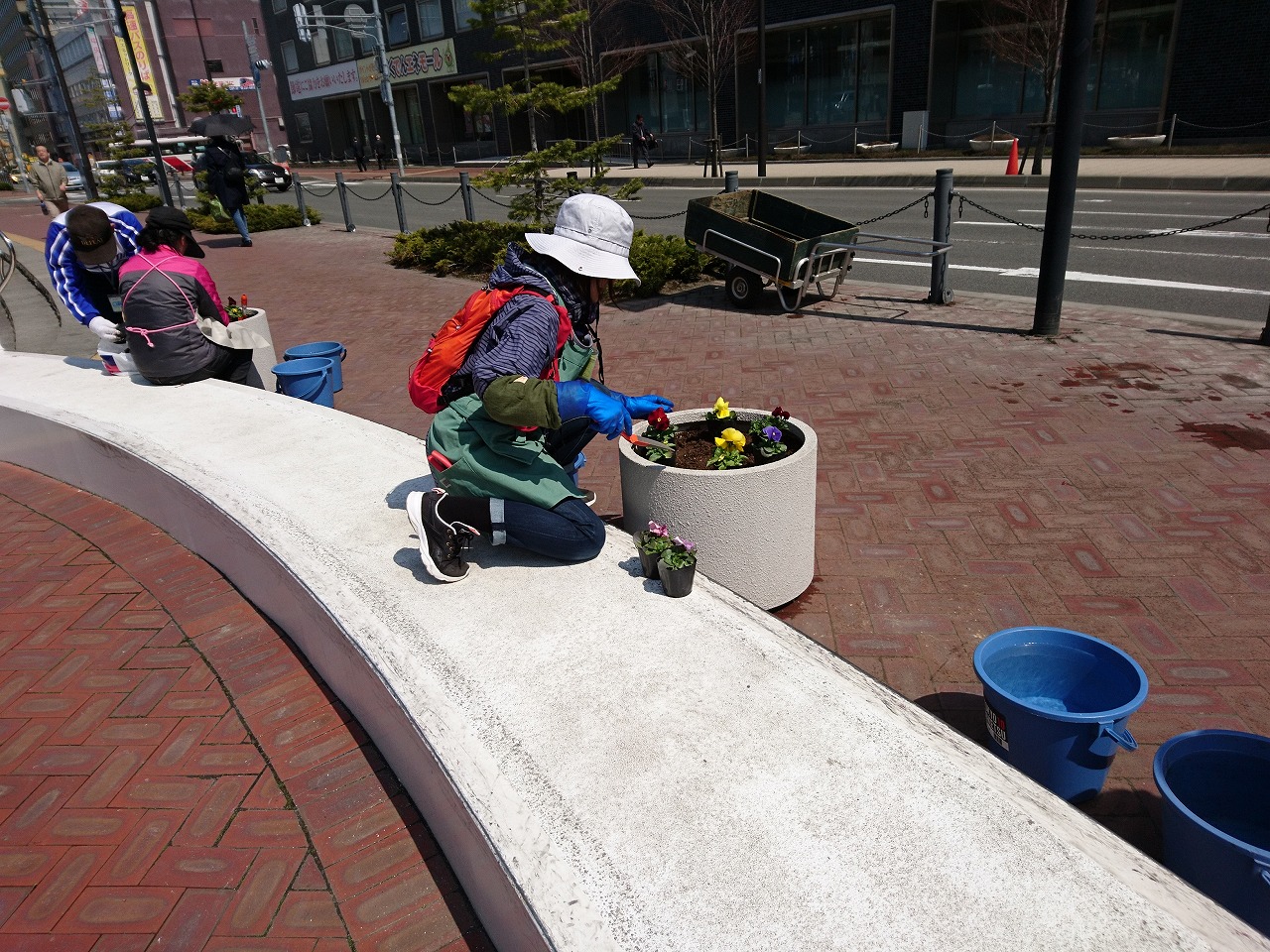 4月19日木曜日、大通公園では花壇推進組合と市民ボランティアの花苗植えが行われる中、創成川公園まん中広場でも花くらぶによる春の花苗の植え込みが行われました。 花くらぶは、新しいメンバーが加わり、活動開始です。 まずは、みんなでデザインを決めます。 みんなで丁寧に植えこんでいきます。 パンジーが元気に育つのが楽しみです。
