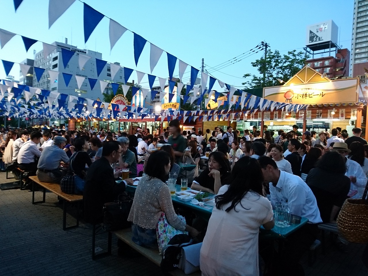 7月20日から、狸二条広場でも「小樽ビールビアガーデン」が始まっています。 7月27日金曜日、ビアガーデンは満員御礼、豊平川の花火大会の花火を楽しむことができました。 夜のビアガーデンはたくさんの人であふれていました。 狸二条広場の北側から見る花火です。