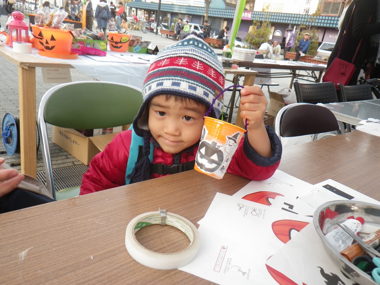用意したランタンづくりの材料がなくなってしまい、急遽、紙コップで作るハロウィン飾りを無料で開催しました。