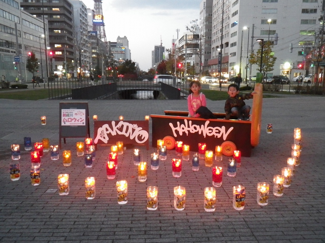 滝野すずらん公園から来てくれたハロウィンバスも大人気で、夜にはキャンドルでライトアップしました。