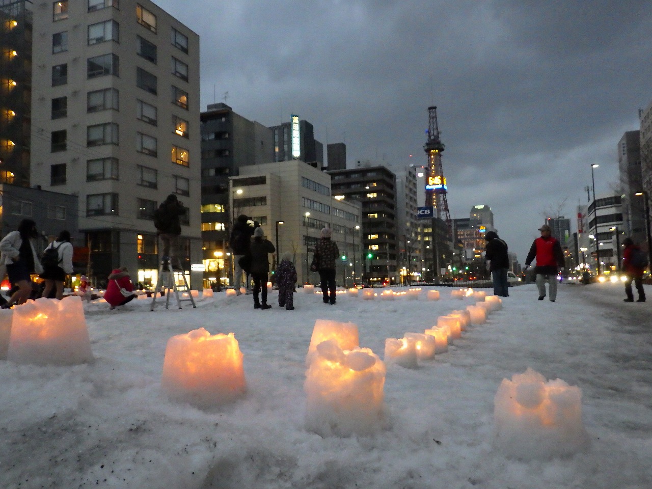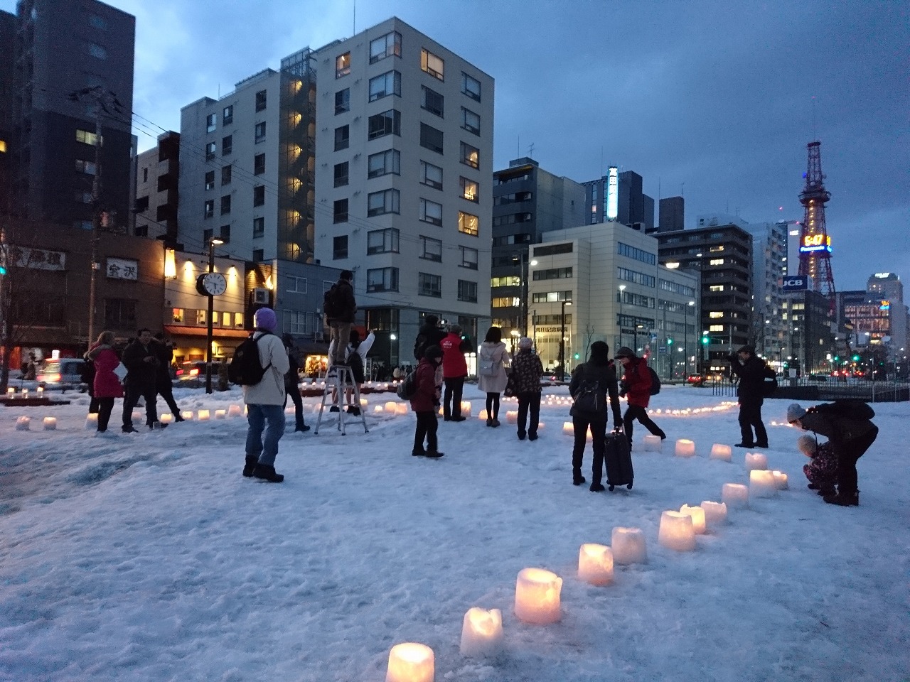 公園ボランティア「お助け隊」のリードの元、地域企業のボランティアさん、大通・創成川の公園ボランティアさんたちが集まって、約500個のロウソクに灯りをともしました。
