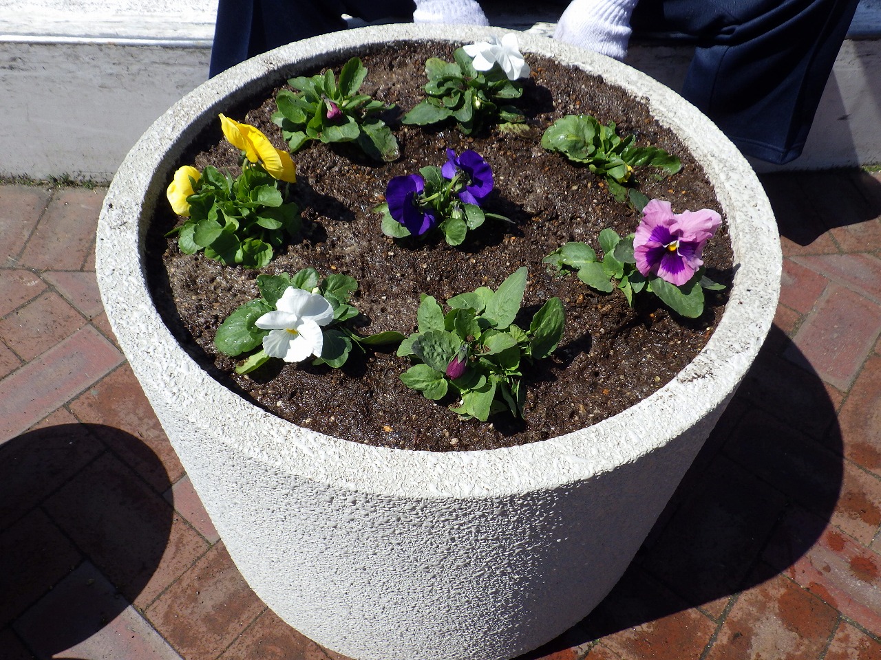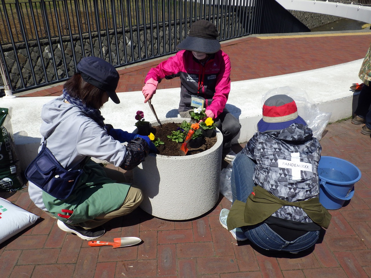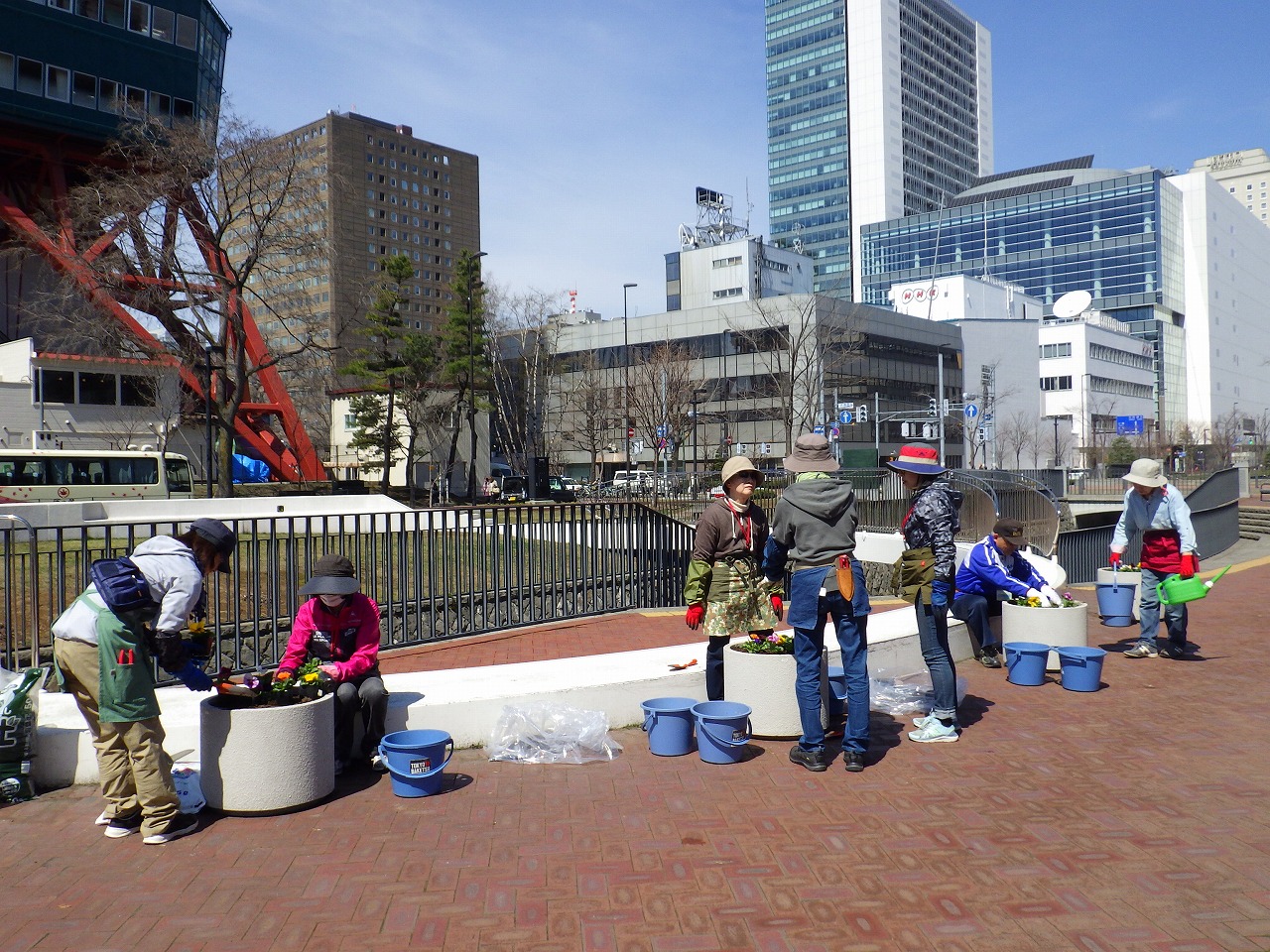 4月18日木曜日、大通公園でも花壇推進組合や市民ボランティアが花植えをしたこの日に、創成川公園のまんなか広場のコンテナにも春の花「パンジー」を植え込みました。 作業を行ったのは、公園ボランティア花くらぶのみなさん。 これから暖かくなって、元気に育ってくれますように。