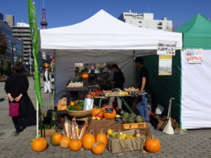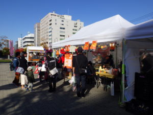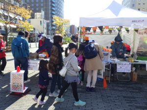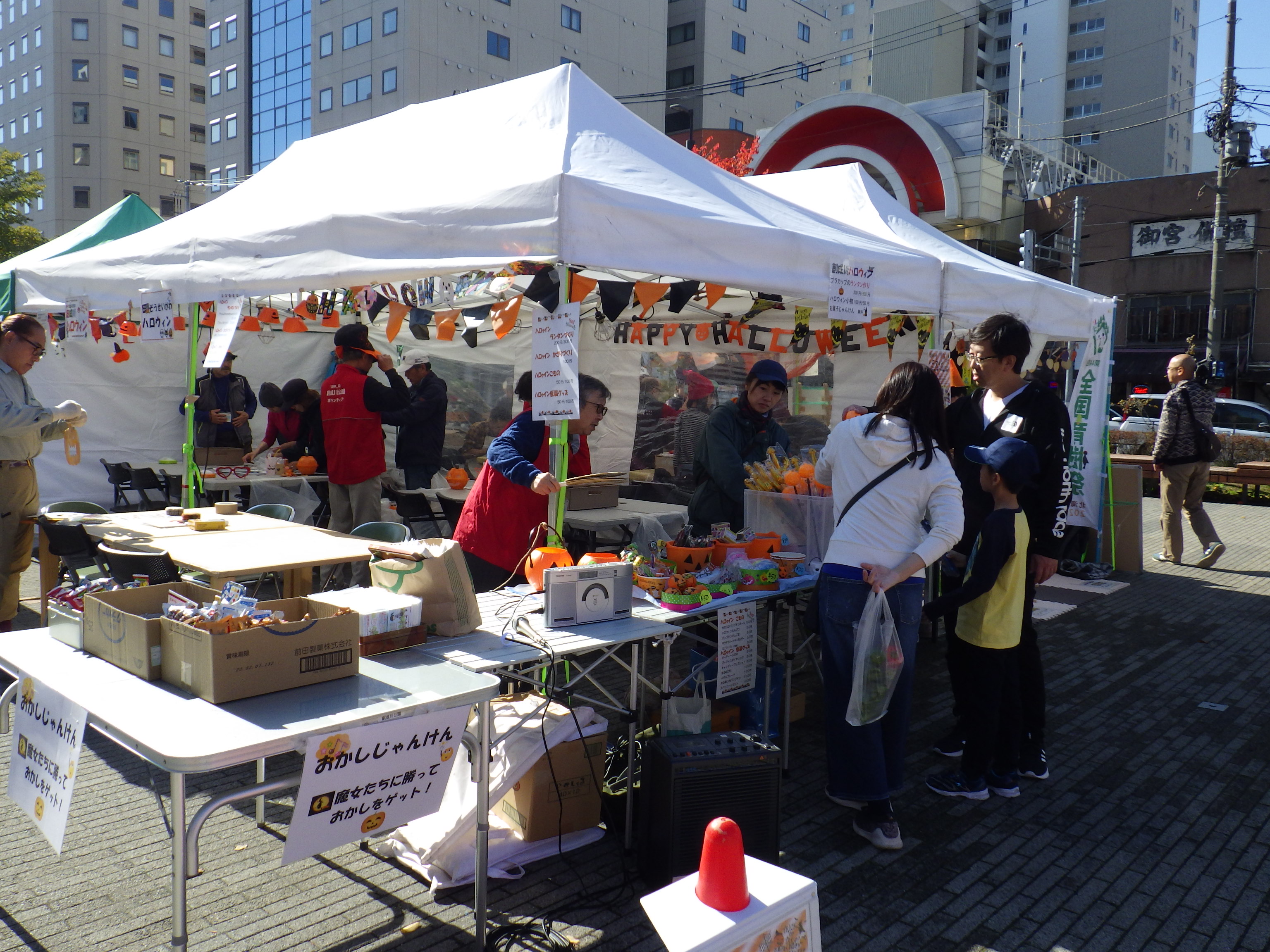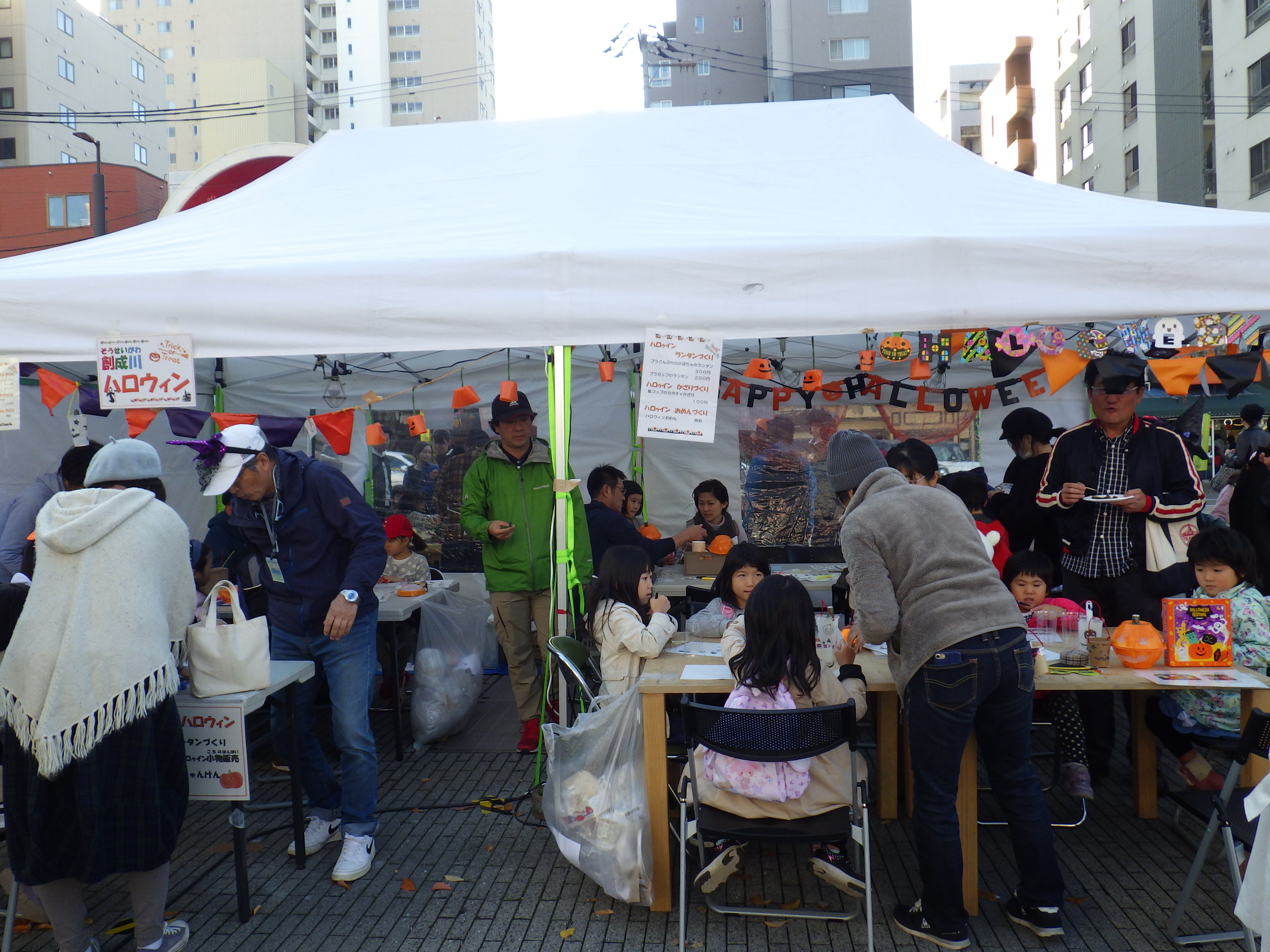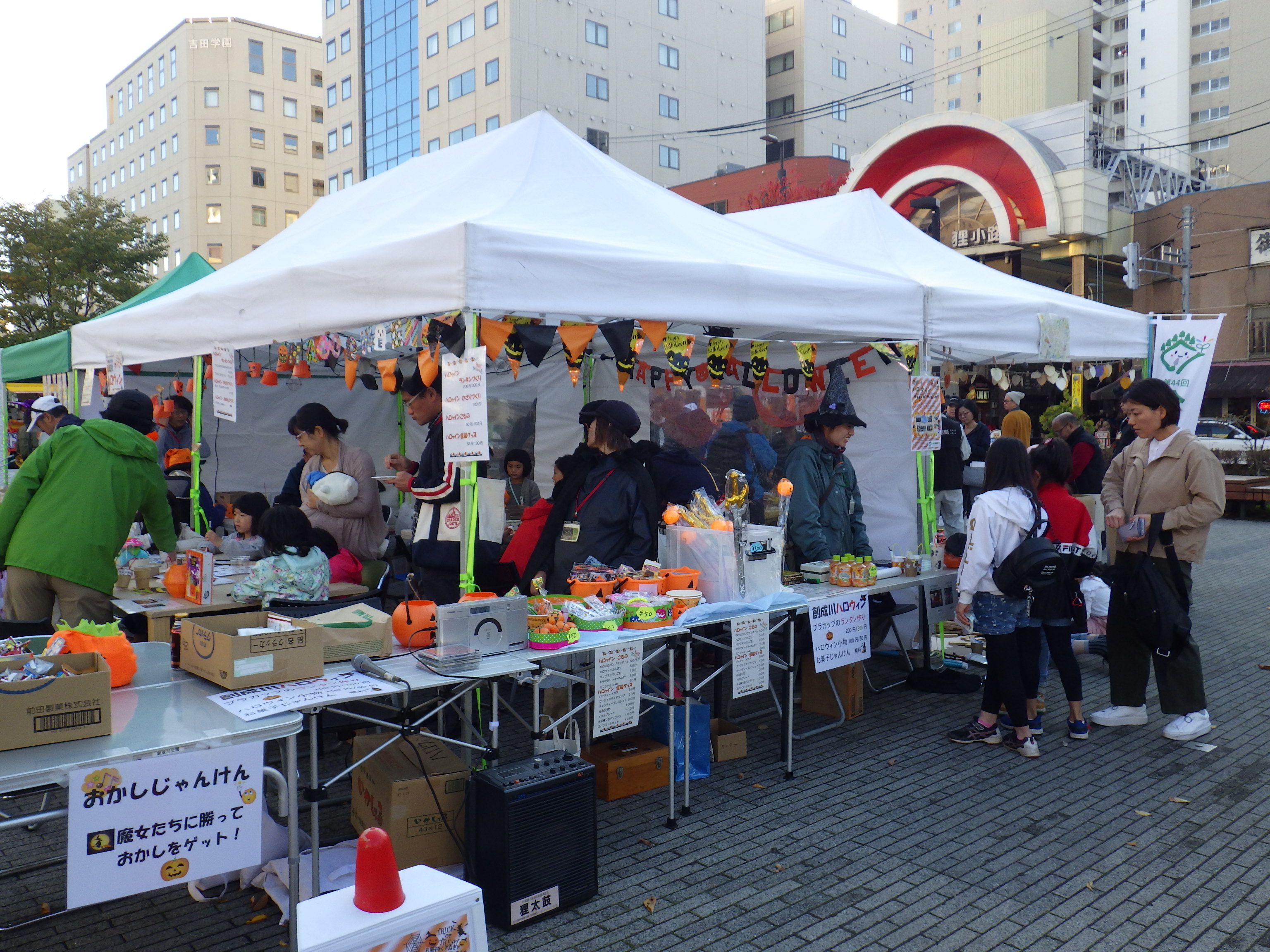 10月20日日曜日、狸二条広場にて創成川ハロウィンを開催しました。 プラカップのランタンづくりや変身小物販売、魔女とお菓子じゃんけんのコーナー ハロウィンカボチャと野菜販売 二条市場の焼き物販売 木育コーナー 移動販売車による飲食の提供 たくさんの皆さまのご参加ありがとうございました。