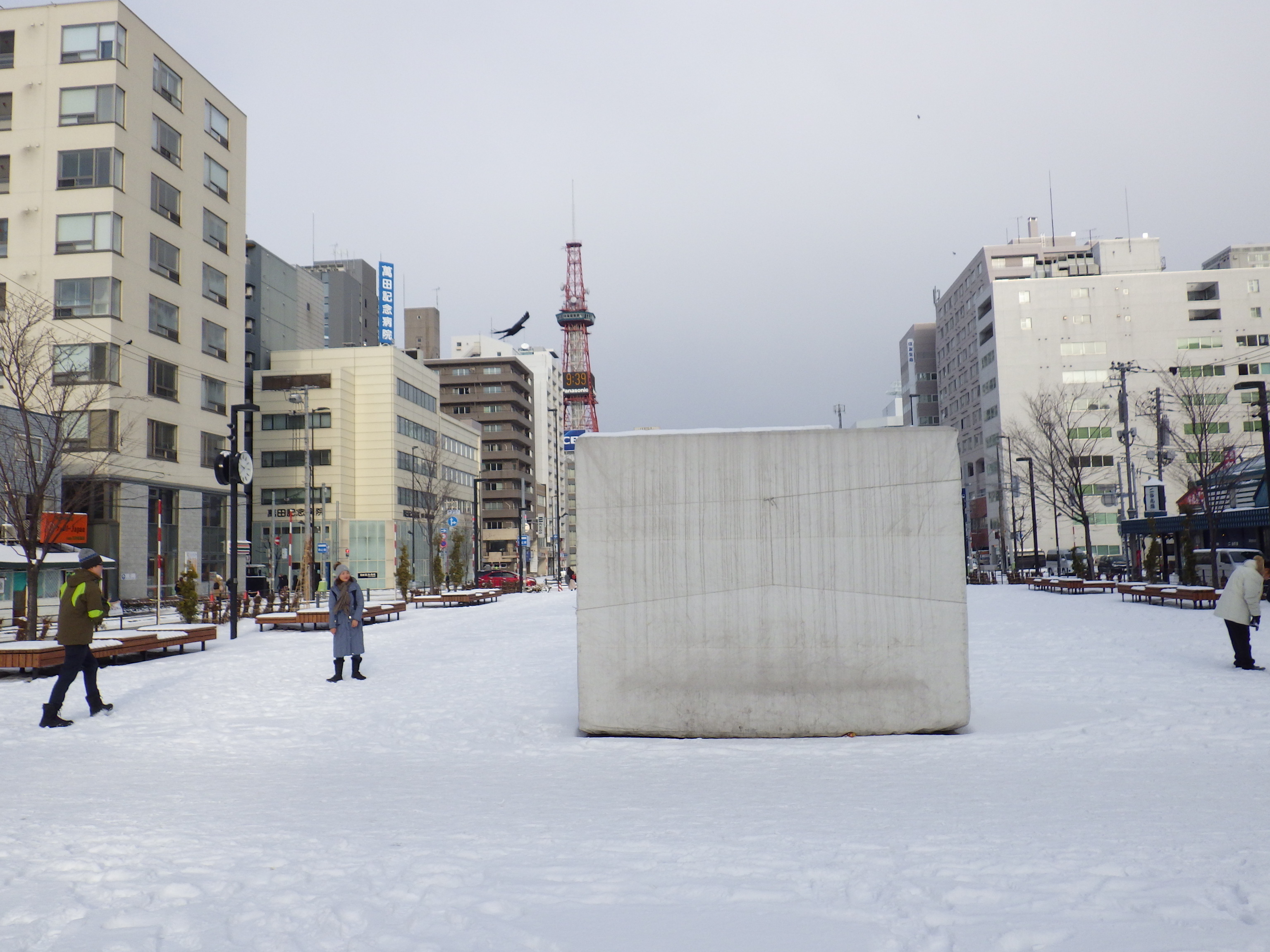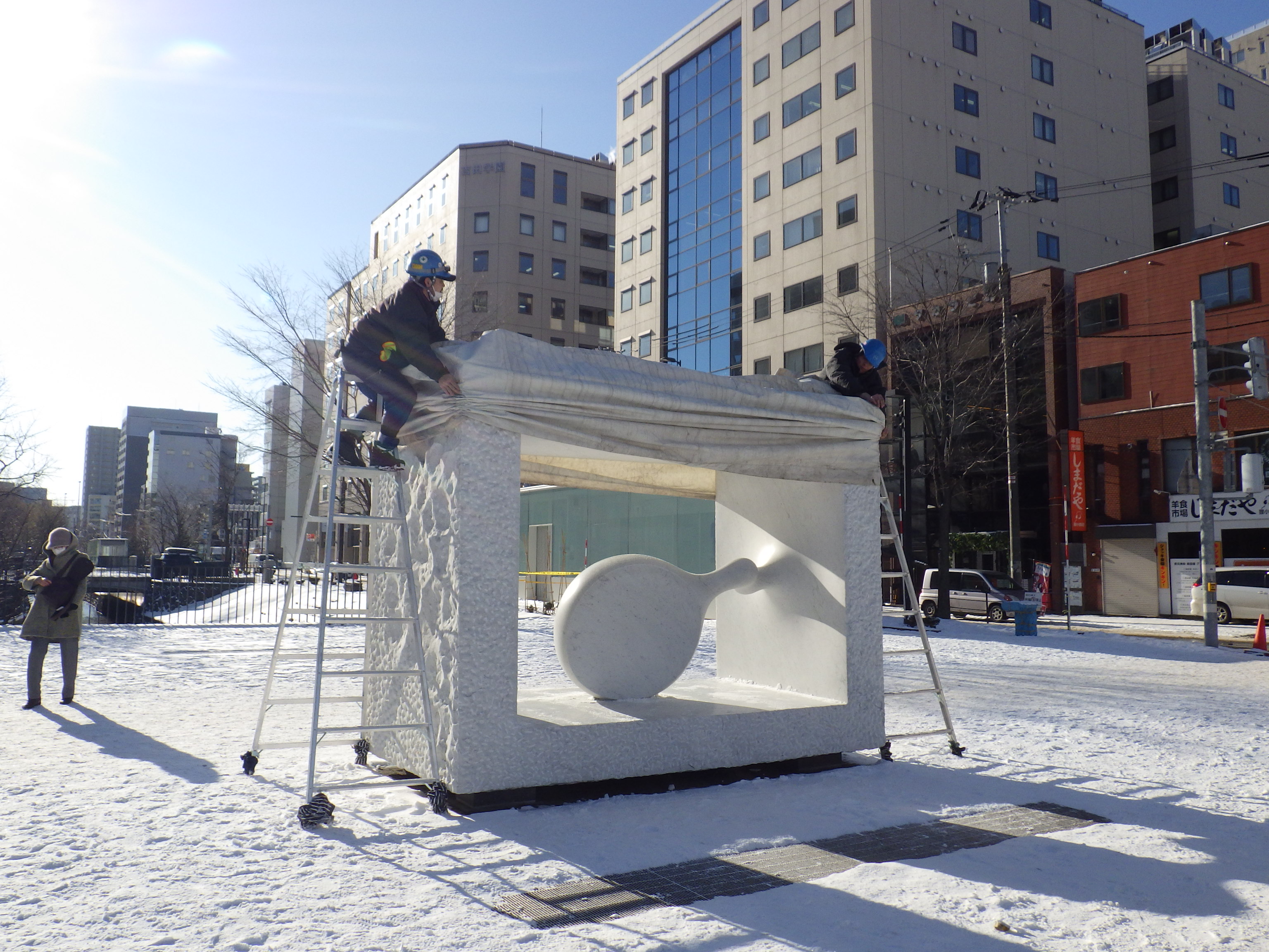 12月9日月曜日、安田侃さんの4つの彫刻作品「生誕」「生棒」「天秘」の冬支度が行われました。