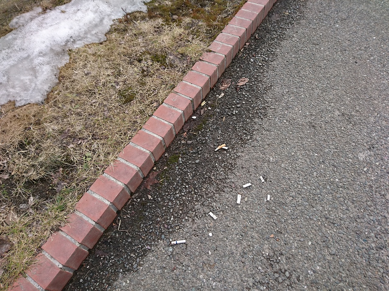 暖かい日が続き、公園にも春が近づいてきました。 南1条、南2条ではまだ雪が残っています。 一番北側、創世スクエア前はもうこんなに雪解けが進みました。 そんな中、雪解け後のごみ拾いでは、毎日タバコの吸い殻ゴミに悩まされています。 公園は禁煙区域ではありませんが、たばこのポイ捨ては禁止です! みなさまのご協力をよろしくお願いいたします。