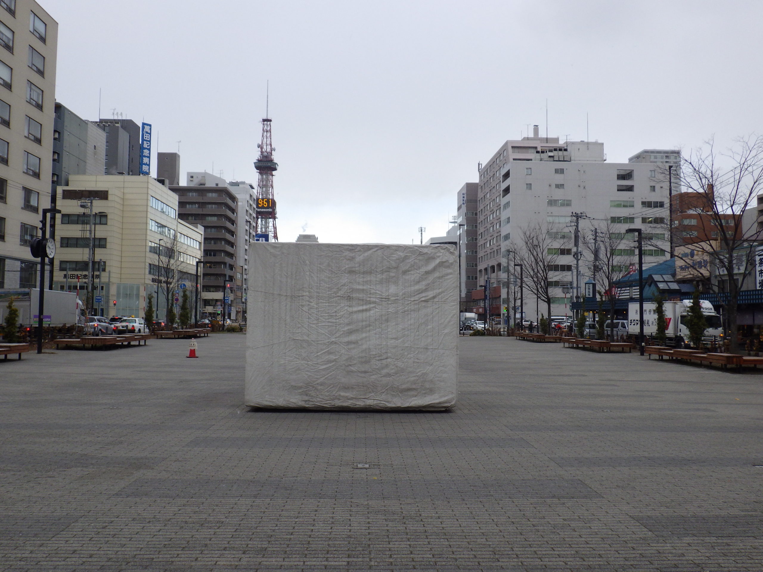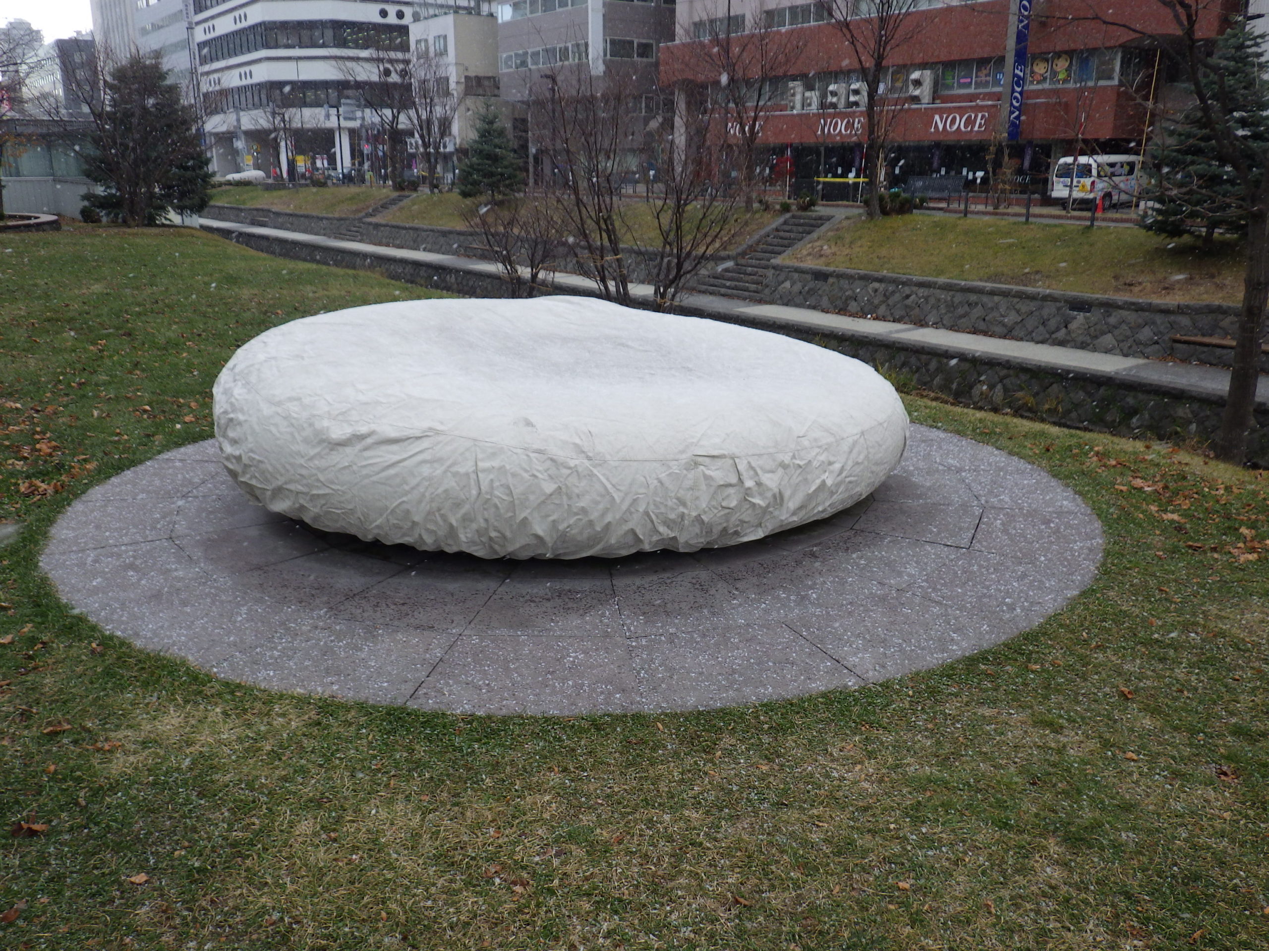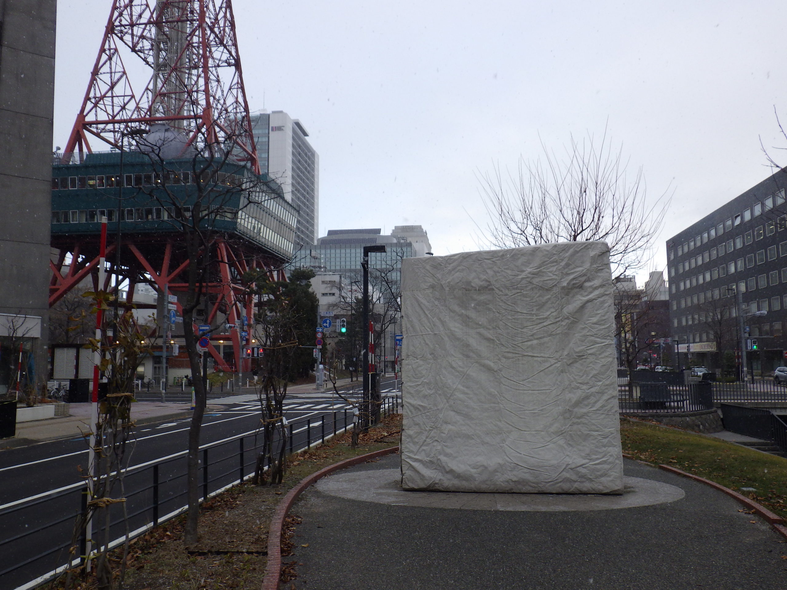 12月3日木曜日、安田侃氏の4つの作品、生誕、生棒、天秘の冬を越すためのシート掛けが行われました。