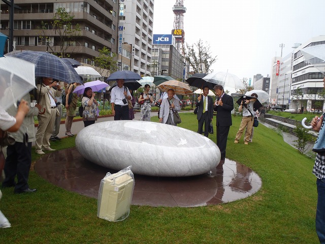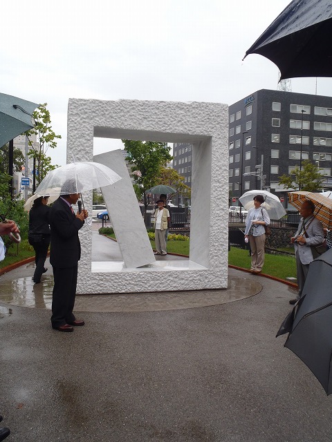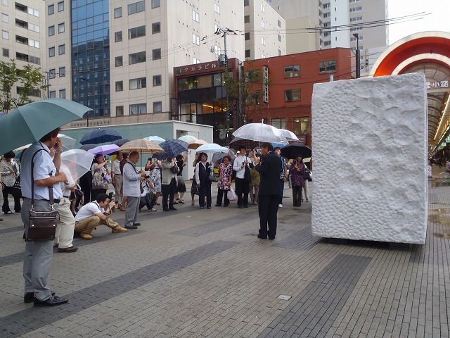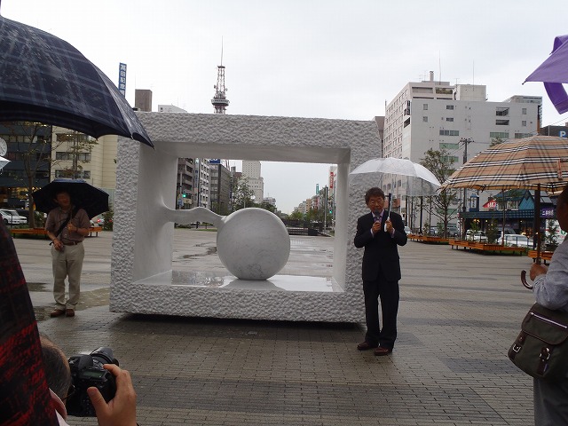 創成川公園にある「生誕」「生棒」「天秘」の4つの作品を制作した彫刻家の安田侃さんの 野外彫刻展が札幌市内で開催されています。 そのオープニングセレモニーが9/3に行われ、安田さんが案内する彫刻鑑賞ツアーの みなさんが、創成川公園の4作品を見にいらっしゃいました。 札幌駅前地下歩行空間~狸小路~創成川公園へ ・・・ ・・・ 台風が近づく雨の中でしたが、 みんな安田さんのお話に聞き入っていました。