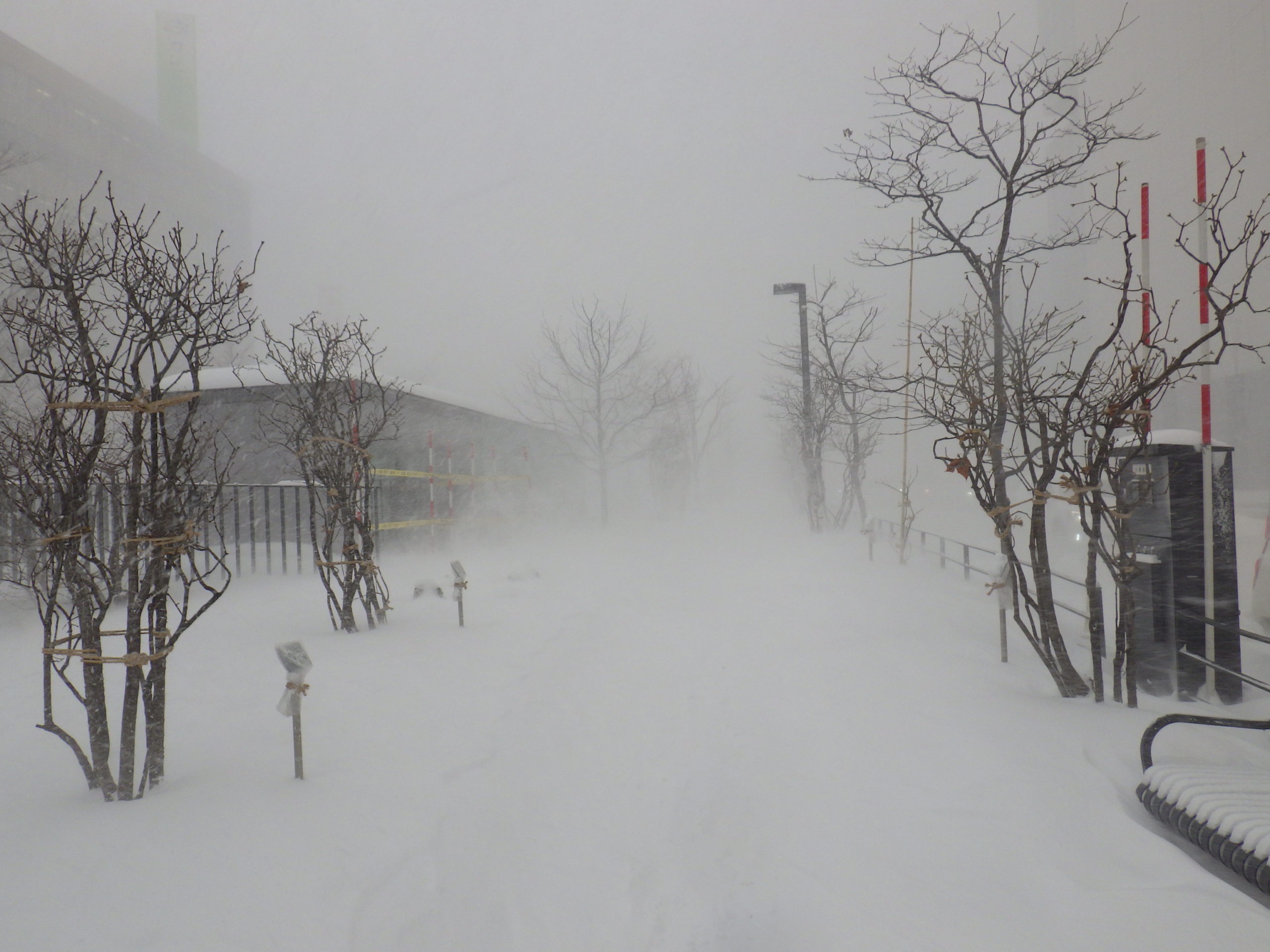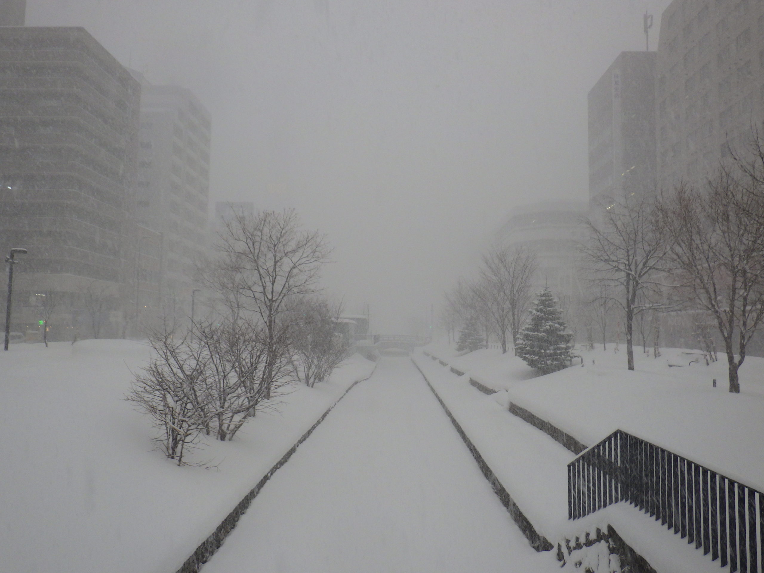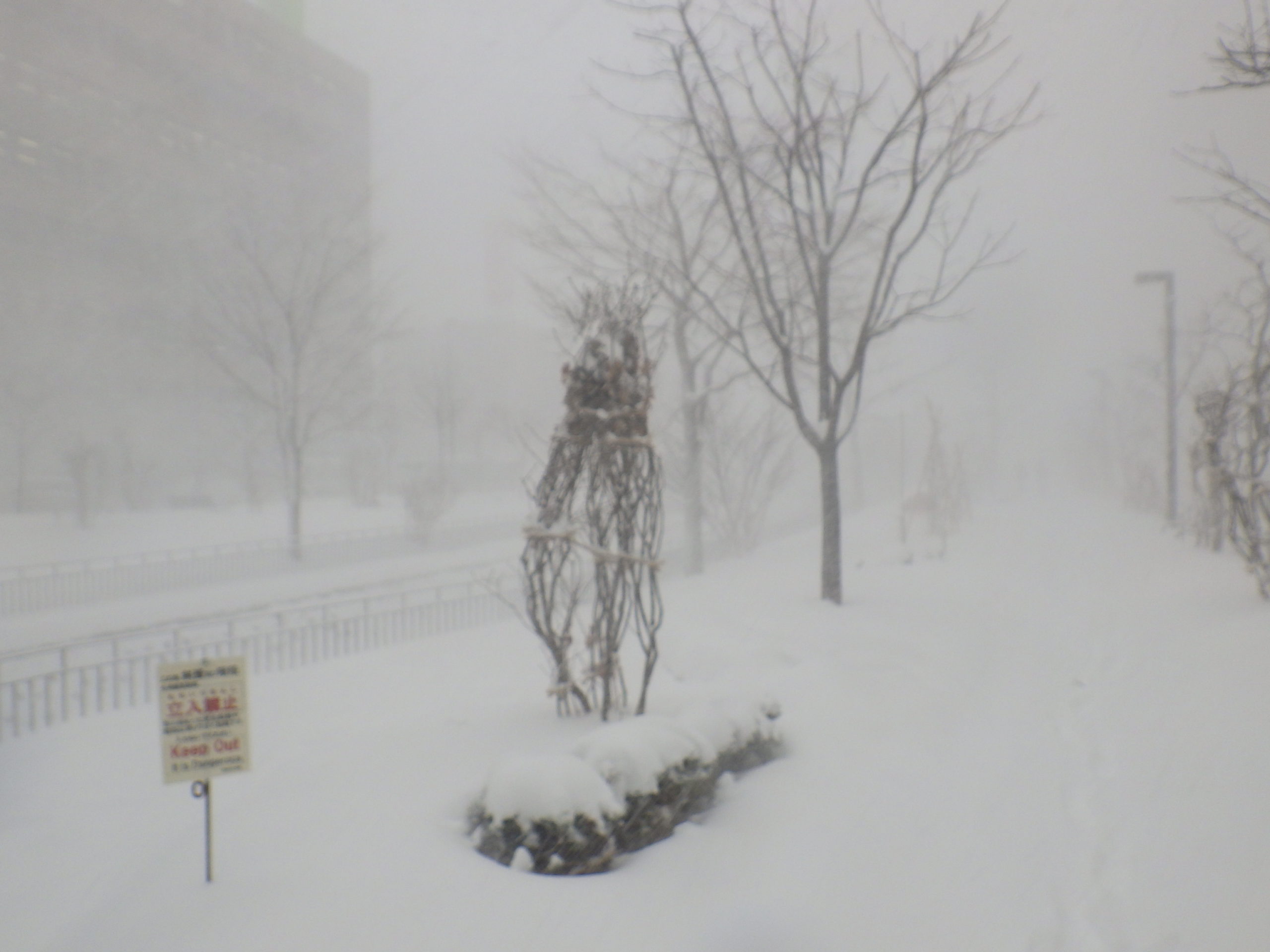 1月19日火曜日、札幌中心部も吹雪となり、ホワイトアウト状態です。 公園の中も、一面真っ白となっています。 ご通行される方、足元にお気を付けてください。 南1条の様子 吹雪の中の里程元標 南2条の様子 北1条通りからテレビ塔が見えません。 風の強い北2条ブロックの様子 ホワイトアウトしてます。