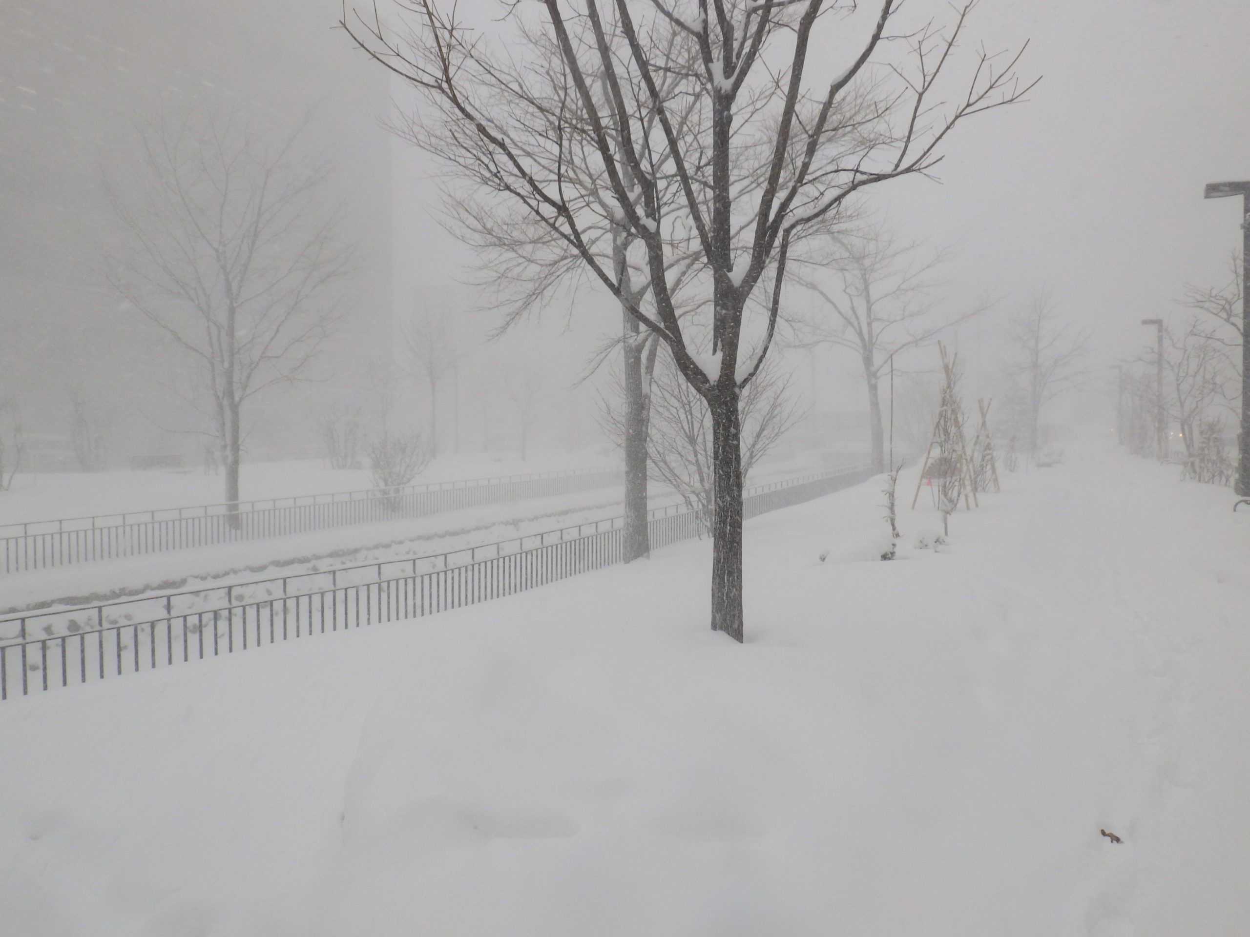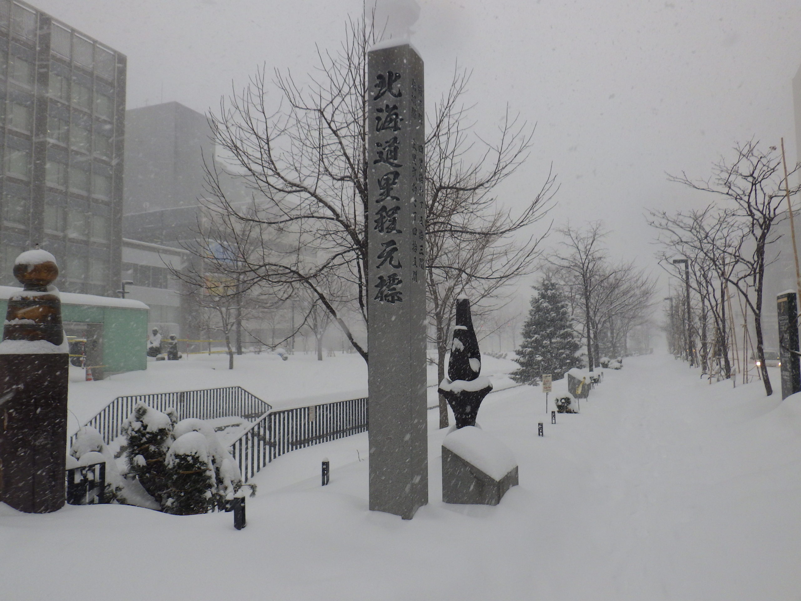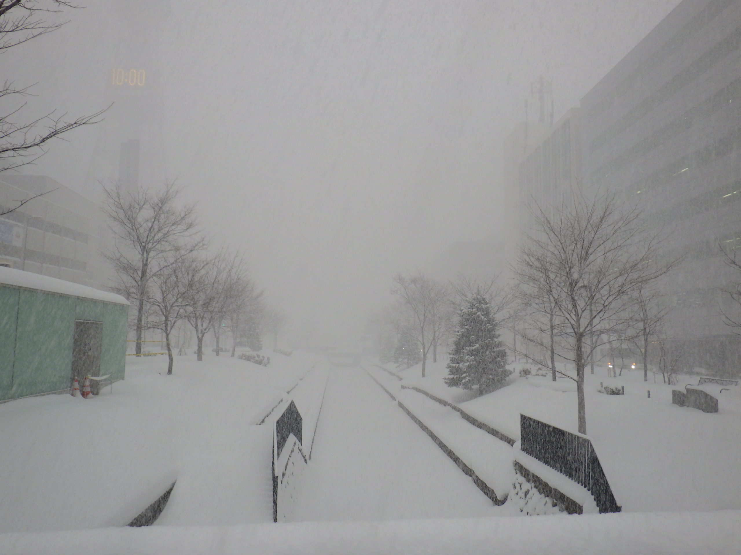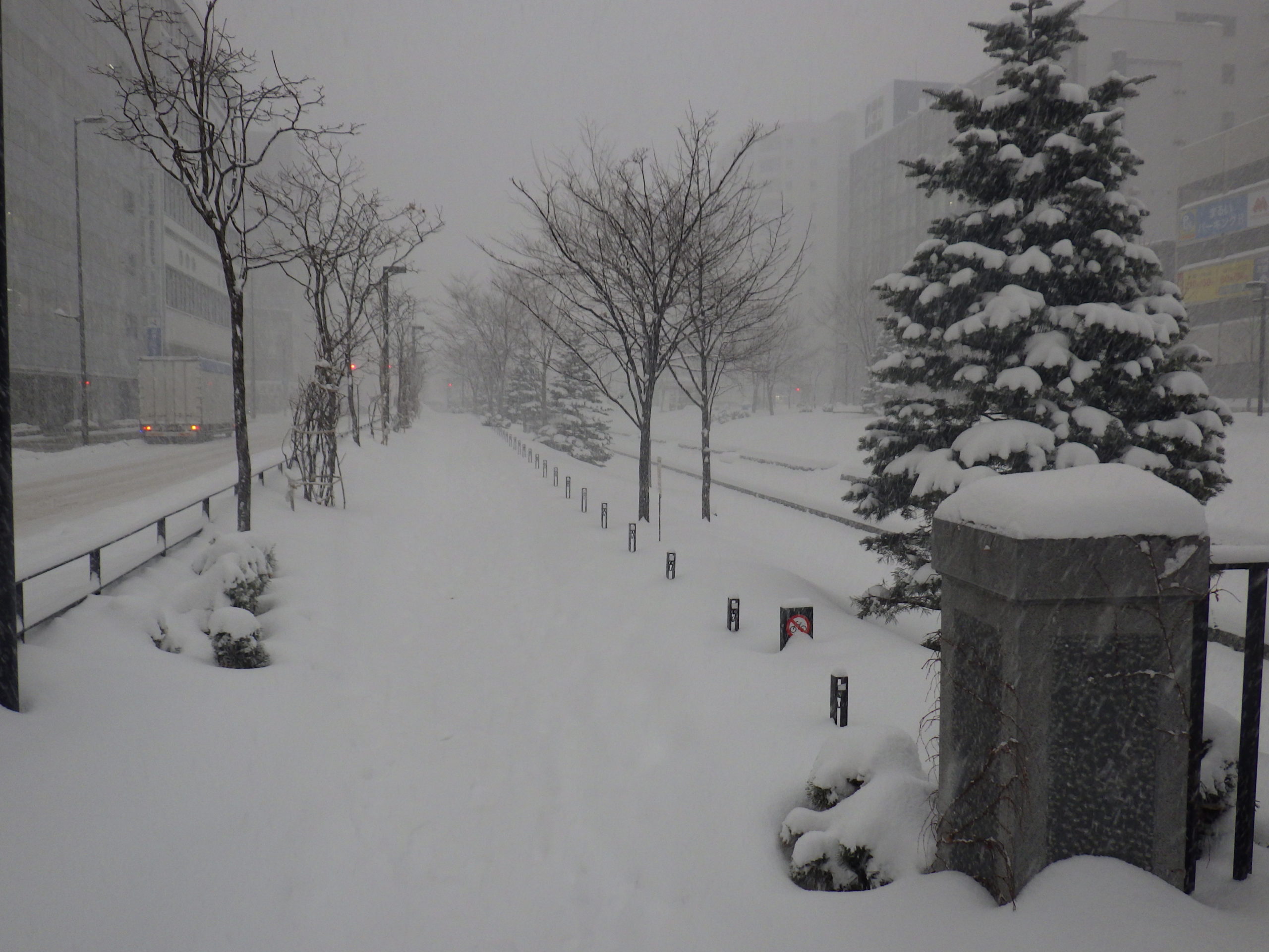 1月19日火曜日、札幌中心部も吹雪となり、ホワイトアウト状態です。 公園の中も、一面真っ白となっています。 ご通行される方、足元にお気を付けてください。 南1条の様子 吹雪の中の里程元標 南2条の様子 北1条通りからテレビ塔が見えません。 風の強い北2条ブロックの様子 ホワイトアウトしてます。