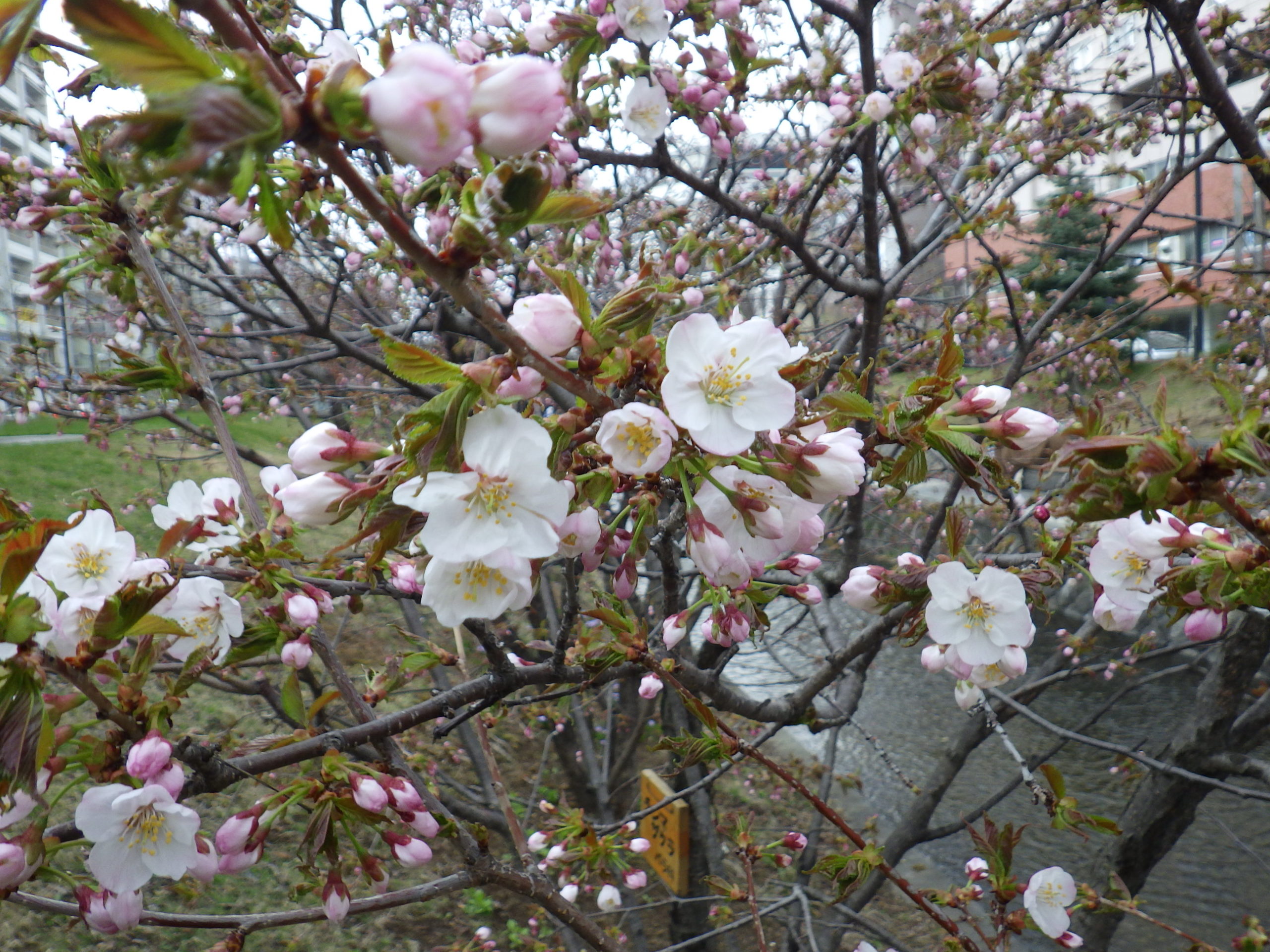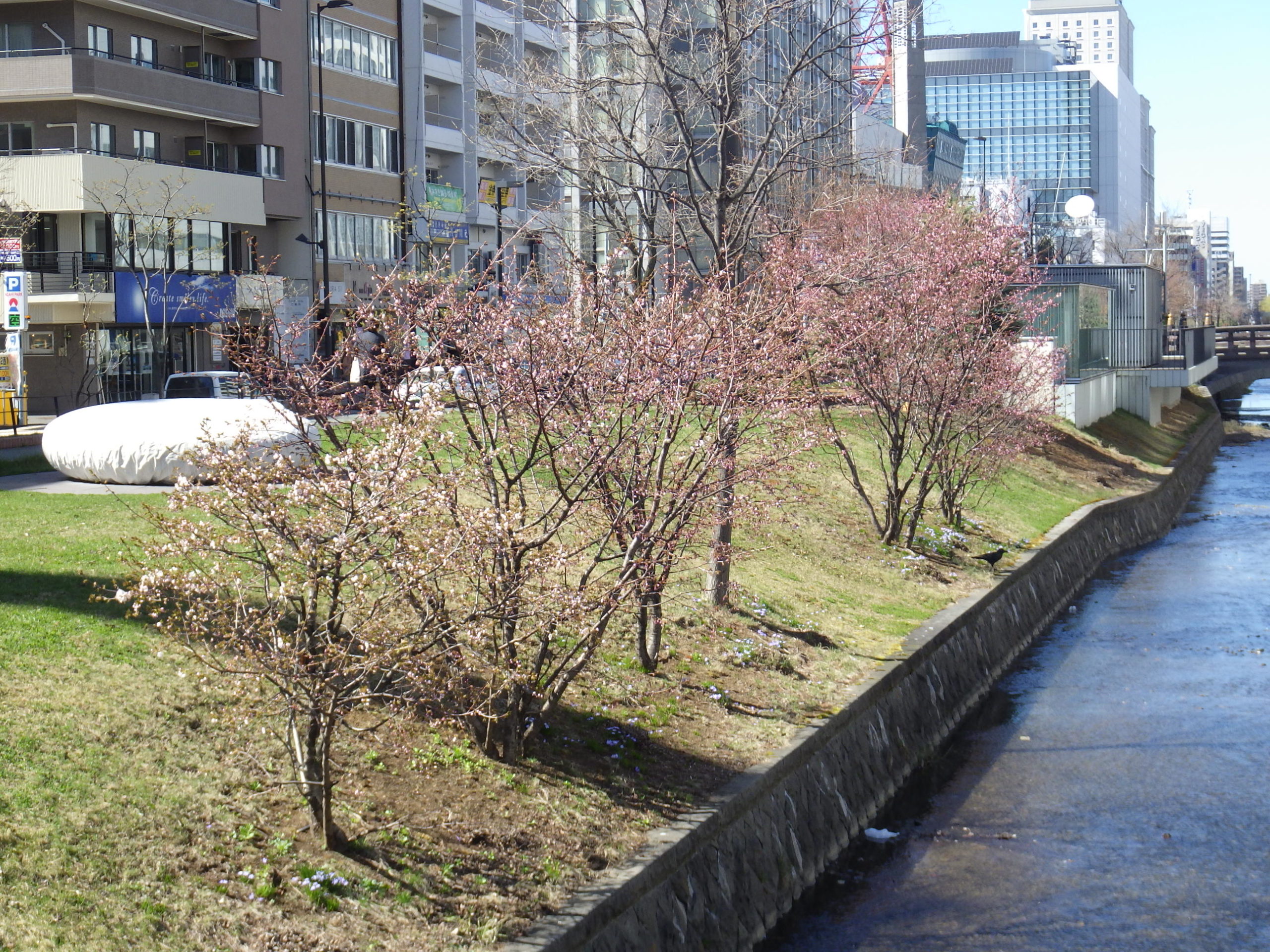 4月20日火曜日、午前中は曇り空、でも午後からは青空となった、公園内のチシマザクラが開花していました。 南2条東側のチシマザクラが早いようです。 北1条東側のエゾヤマザクラも、数輪、花開いていました。 春がやって来ましたね。