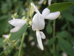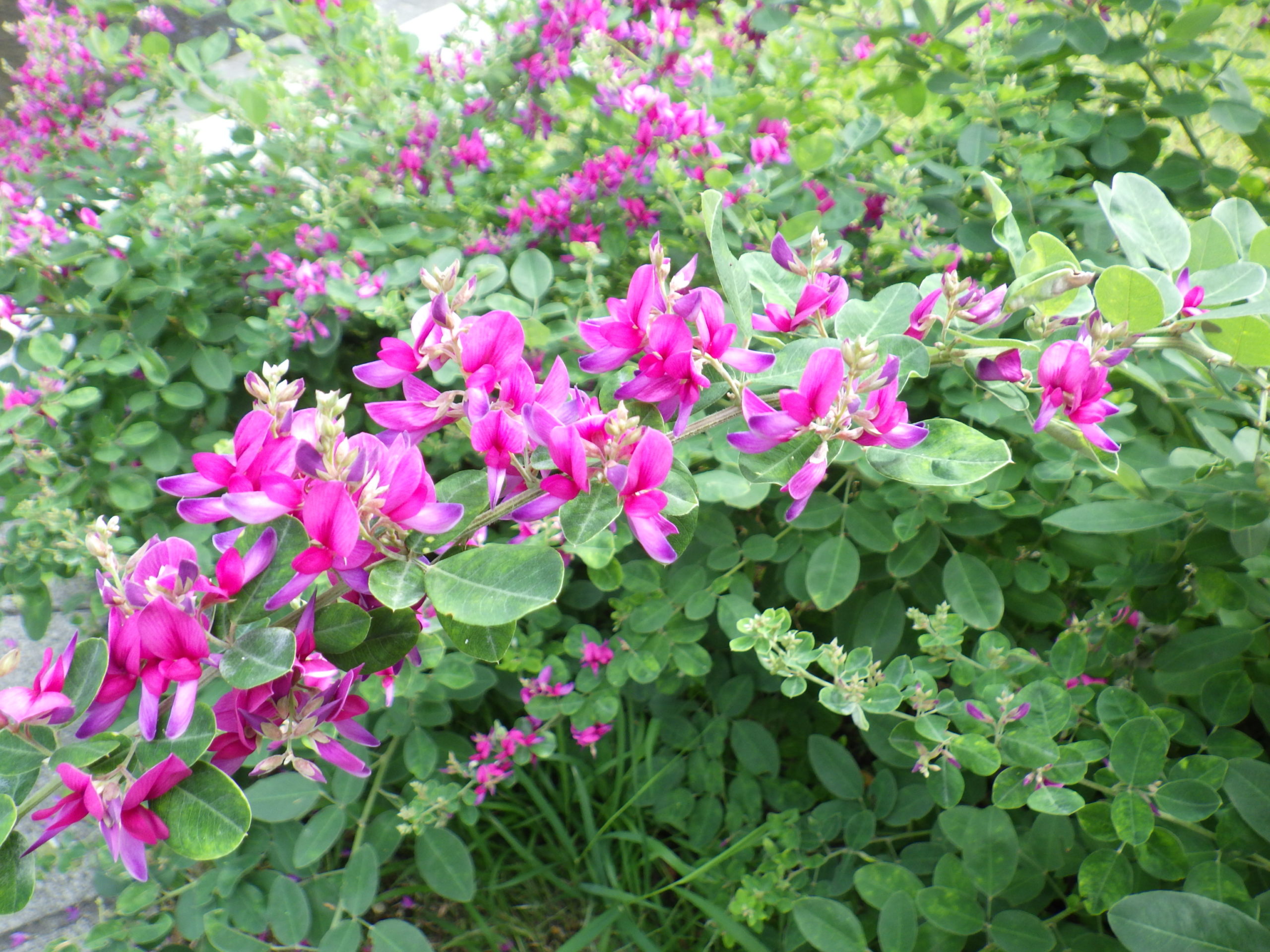 園内に植えられているのは、赤花と白花のミヤギノハギ、シラハギ、です。ミヤギノハギは枝が長く垂れて花が咲きますが、シラハギはあまり枝が垂れずに斜上してミヤギノハギより10日ほど遅れて白い花を咲かせます。またミヤギノハギによく似た野生種のケハギも交ざっていますが、ミヤギノハギより葉が丸いので見分けられます。