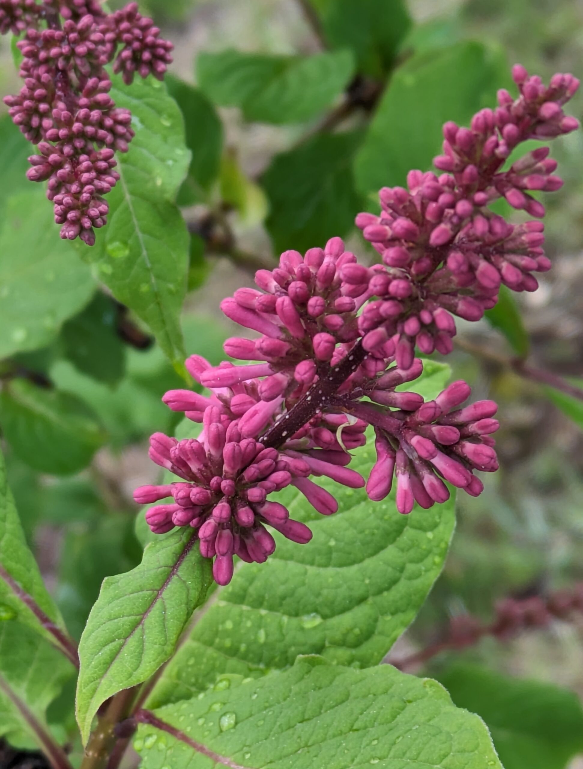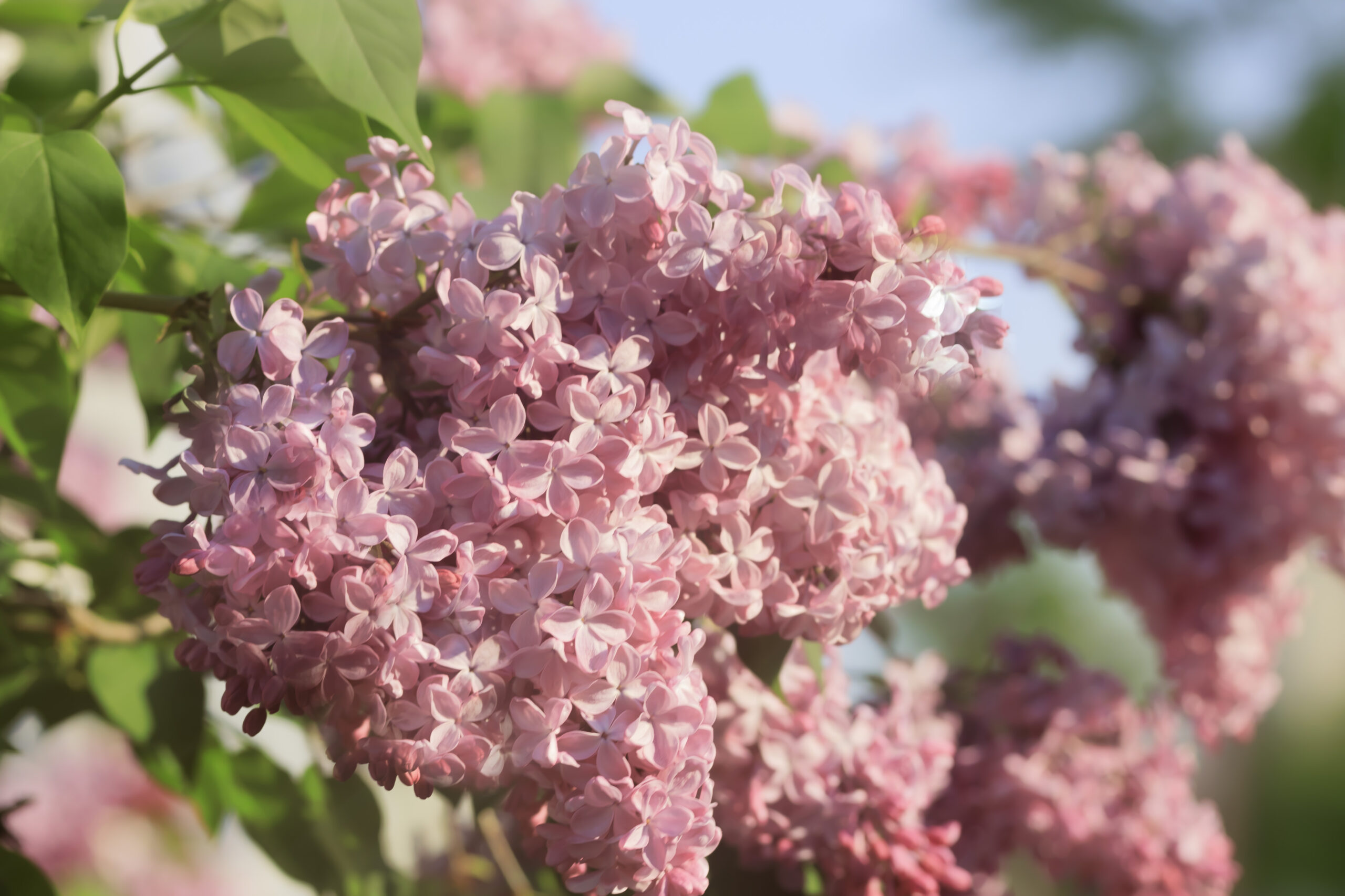 晩春の夕陽が遅咲きのライラックを優しく照らしていました