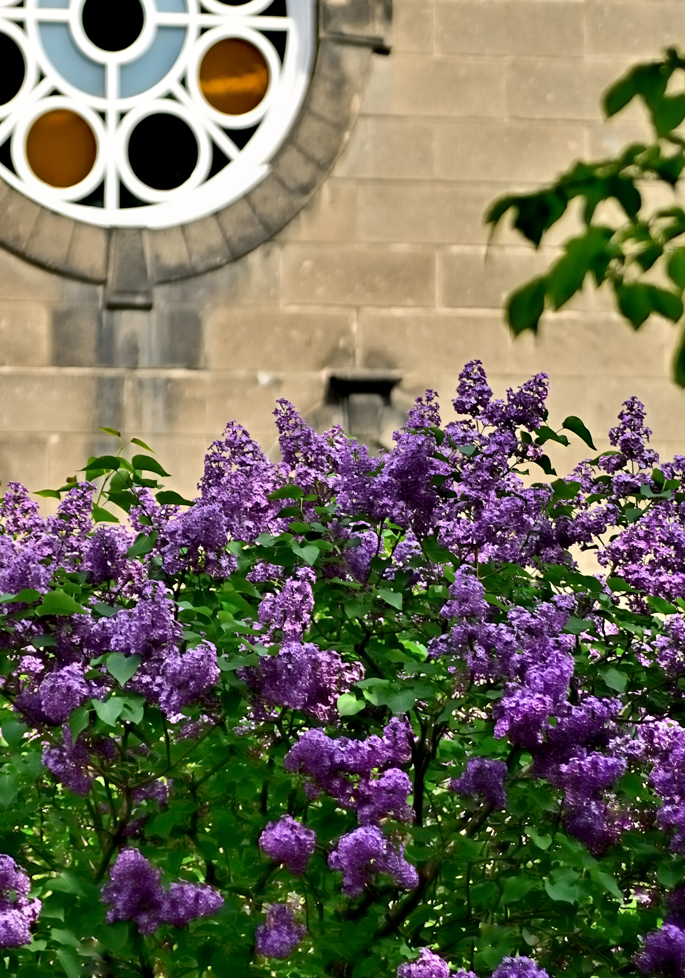 薄日の中、石造りの教会を背に、紫色がきれいでした。