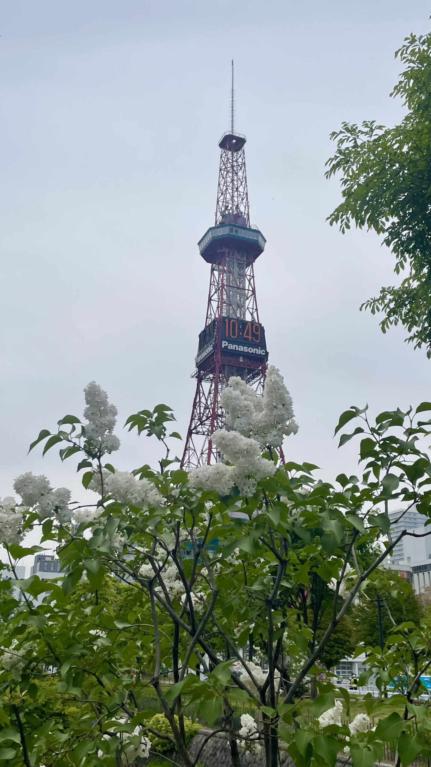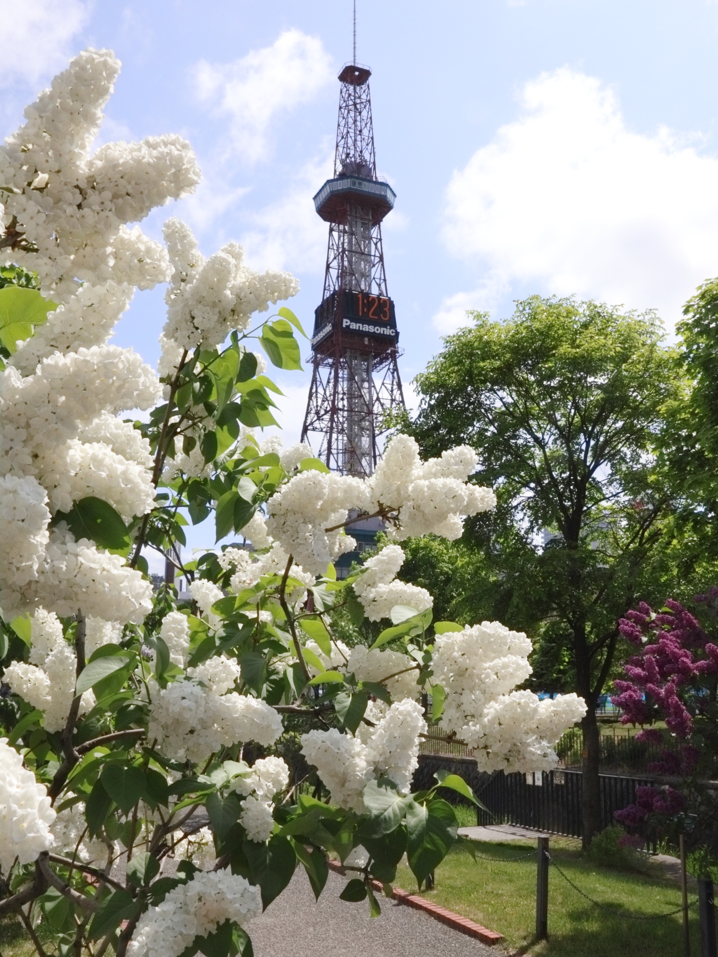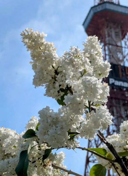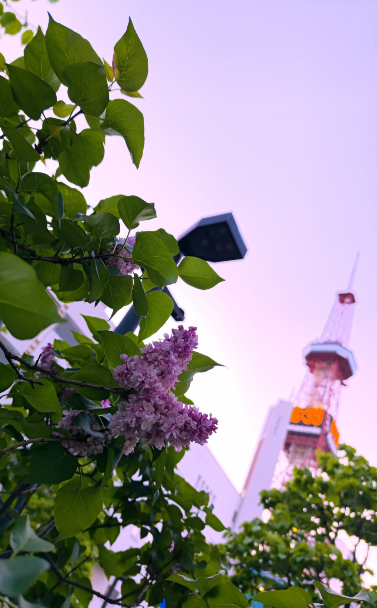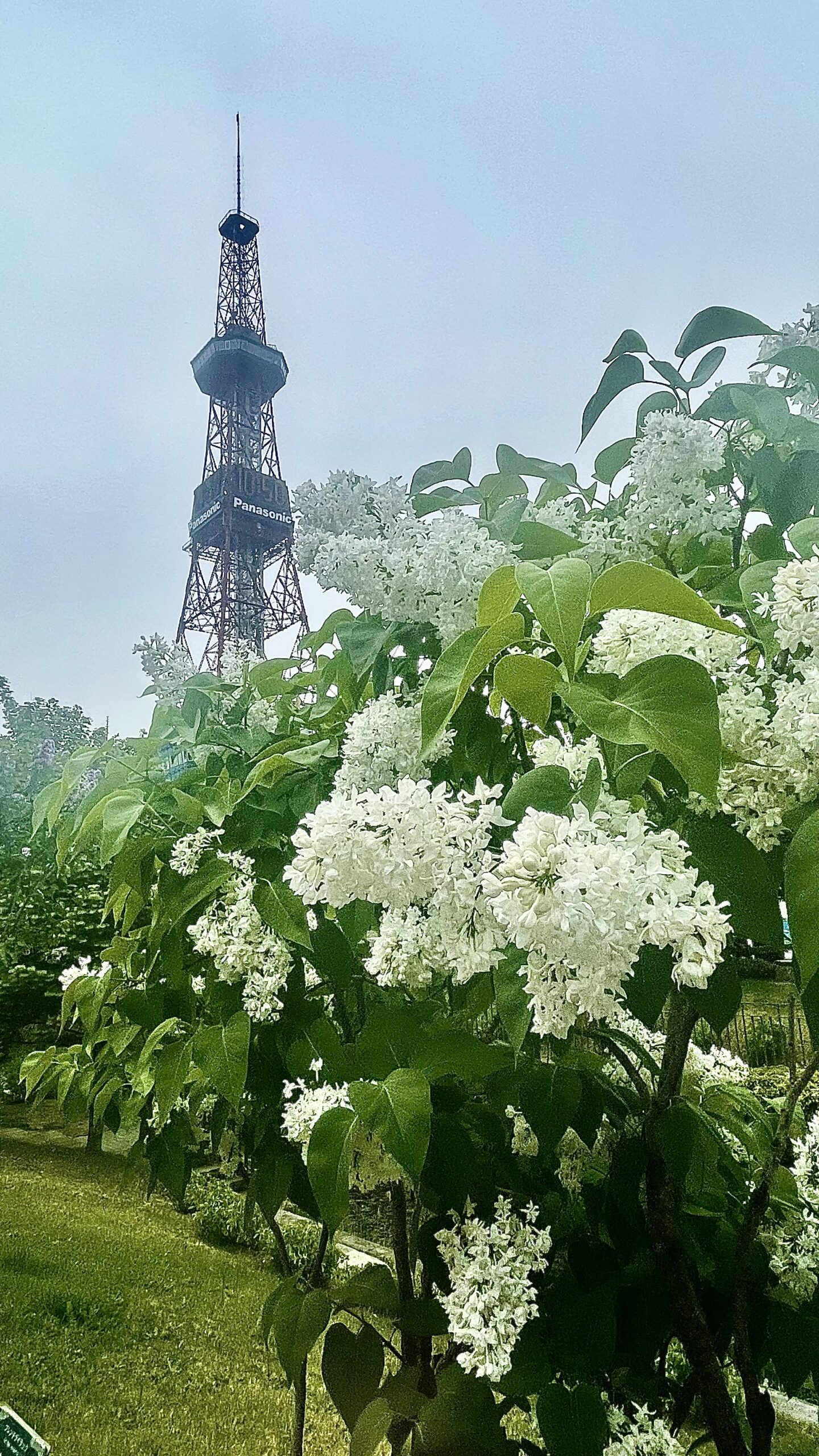 メッセージ:創生通りをウォーキング中にパチリ、やや霞んだ空の白に、白いライラックとTV塔の赤のコントラストが綺麗です。