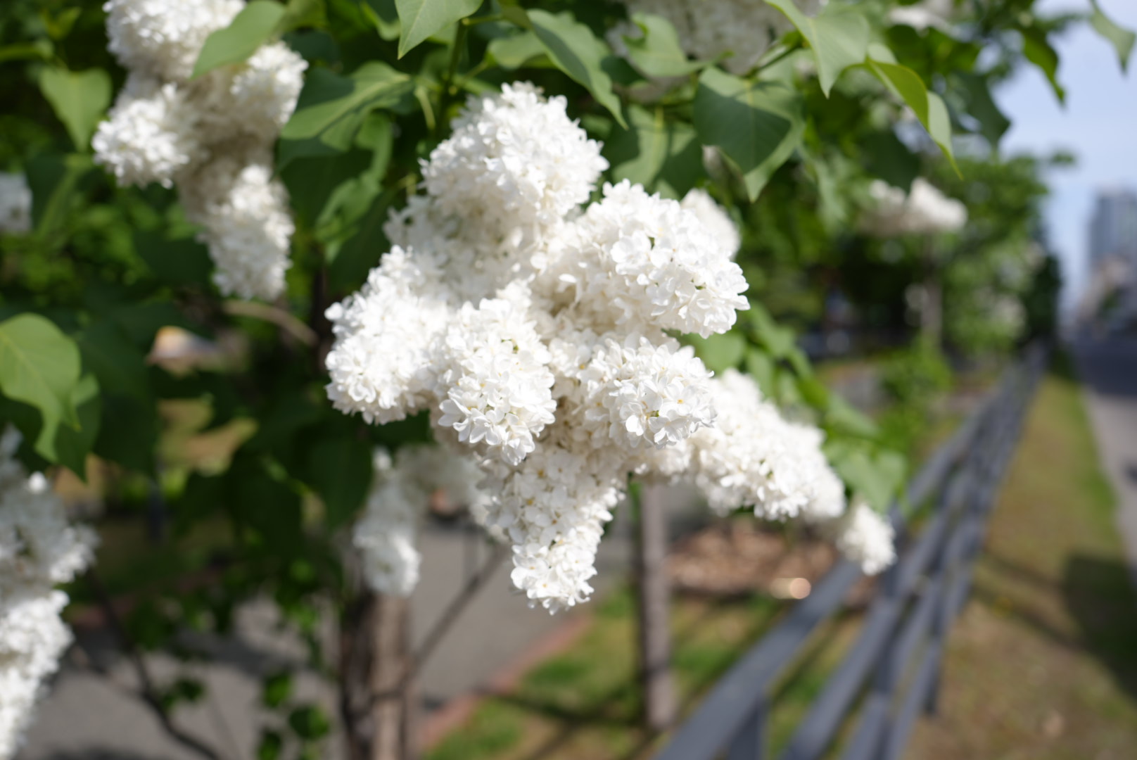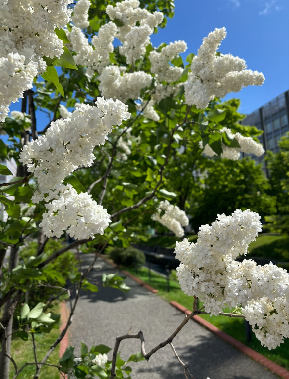 メッセージ:新緑の瑞々しい緑に白いライラックが美しく映え、創生通りを彩っています。