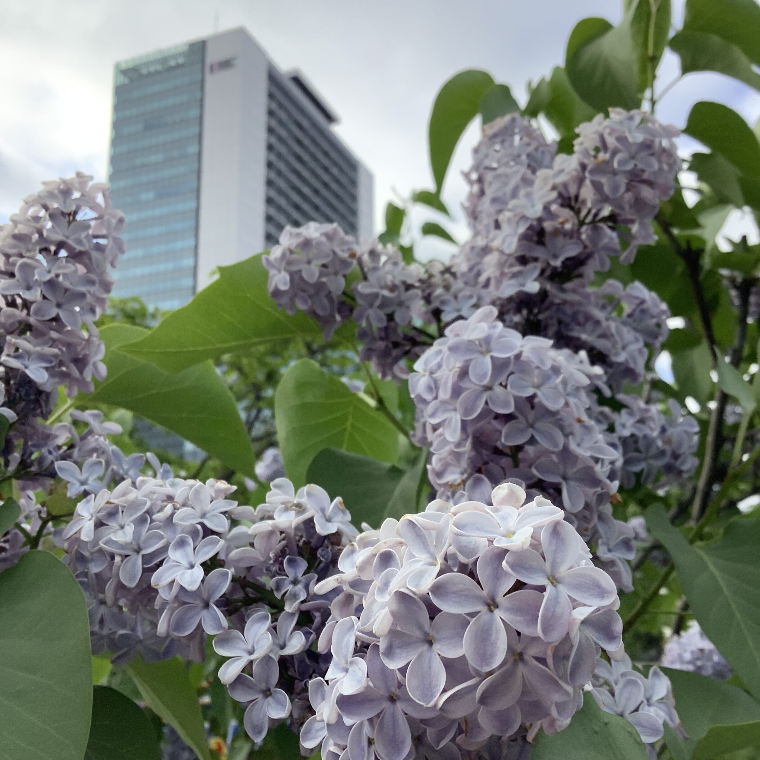 メッセージ:ライラックの花と都会の高層ビル 違和感無くマッチします。安らぎの空間になっています。