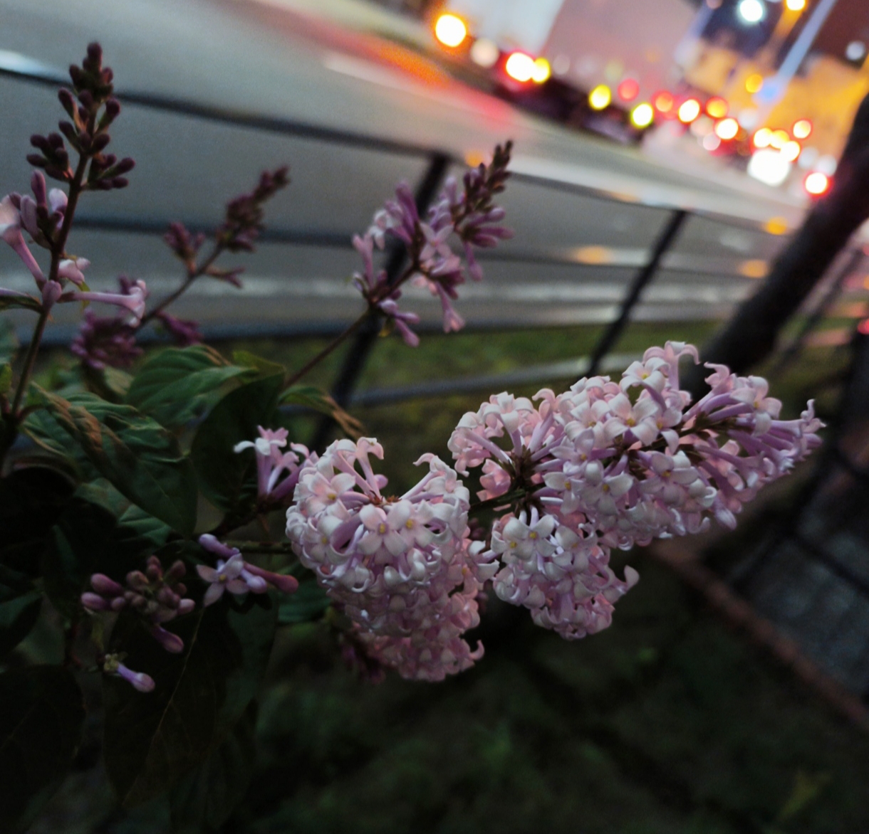 メッセージ:公園の片隅で、斜光を浴びて咲いているライラックを撮影。