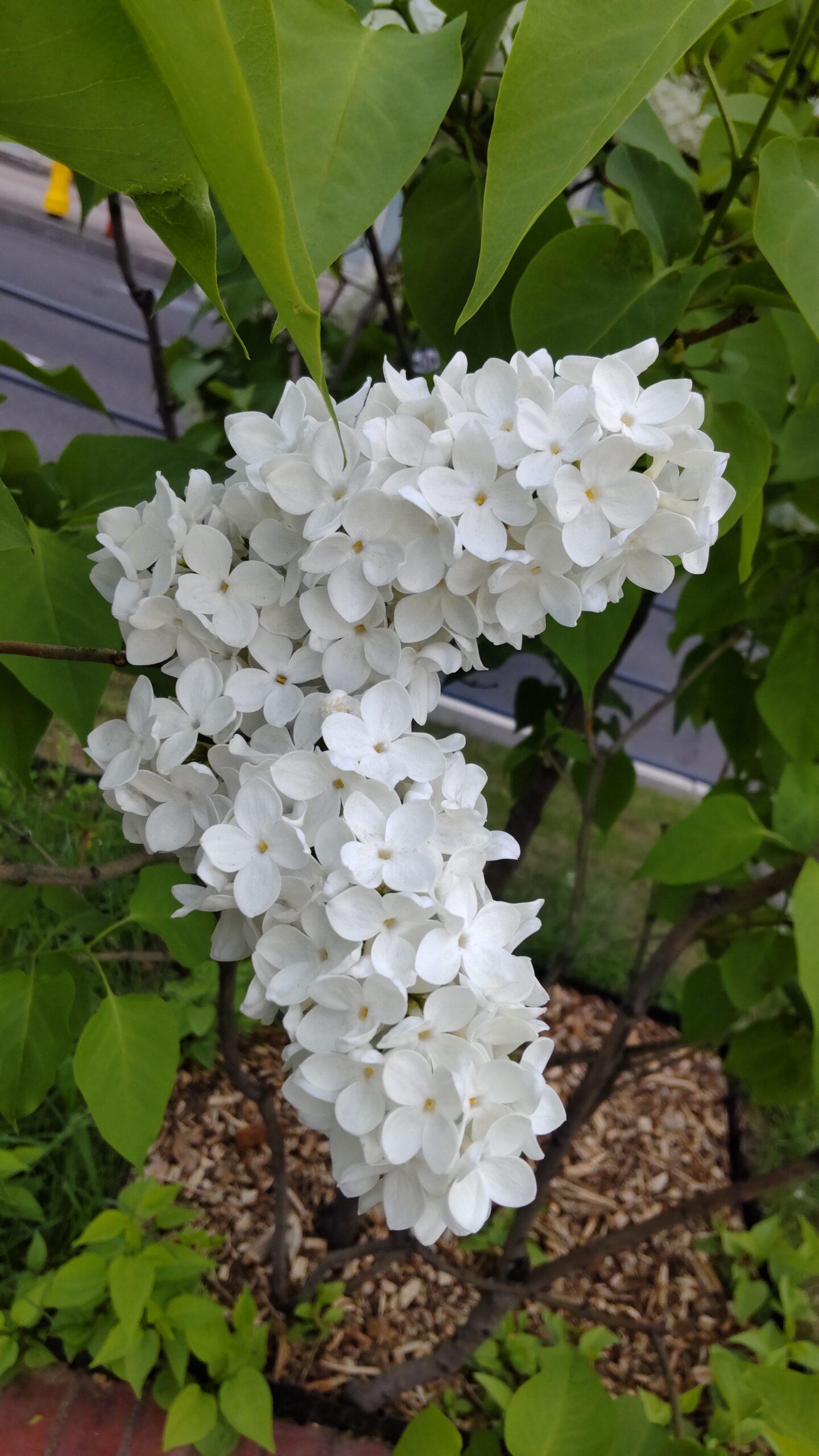 メッセージ:創成川をぐるりと散策してライラックの品種の多さにビックリ!一番のお気に入りはマダム・フローレント・ステップマンです。白い貴婦人のような可憐な花です。枝振りはサインはVをしているよう。平和ですね!