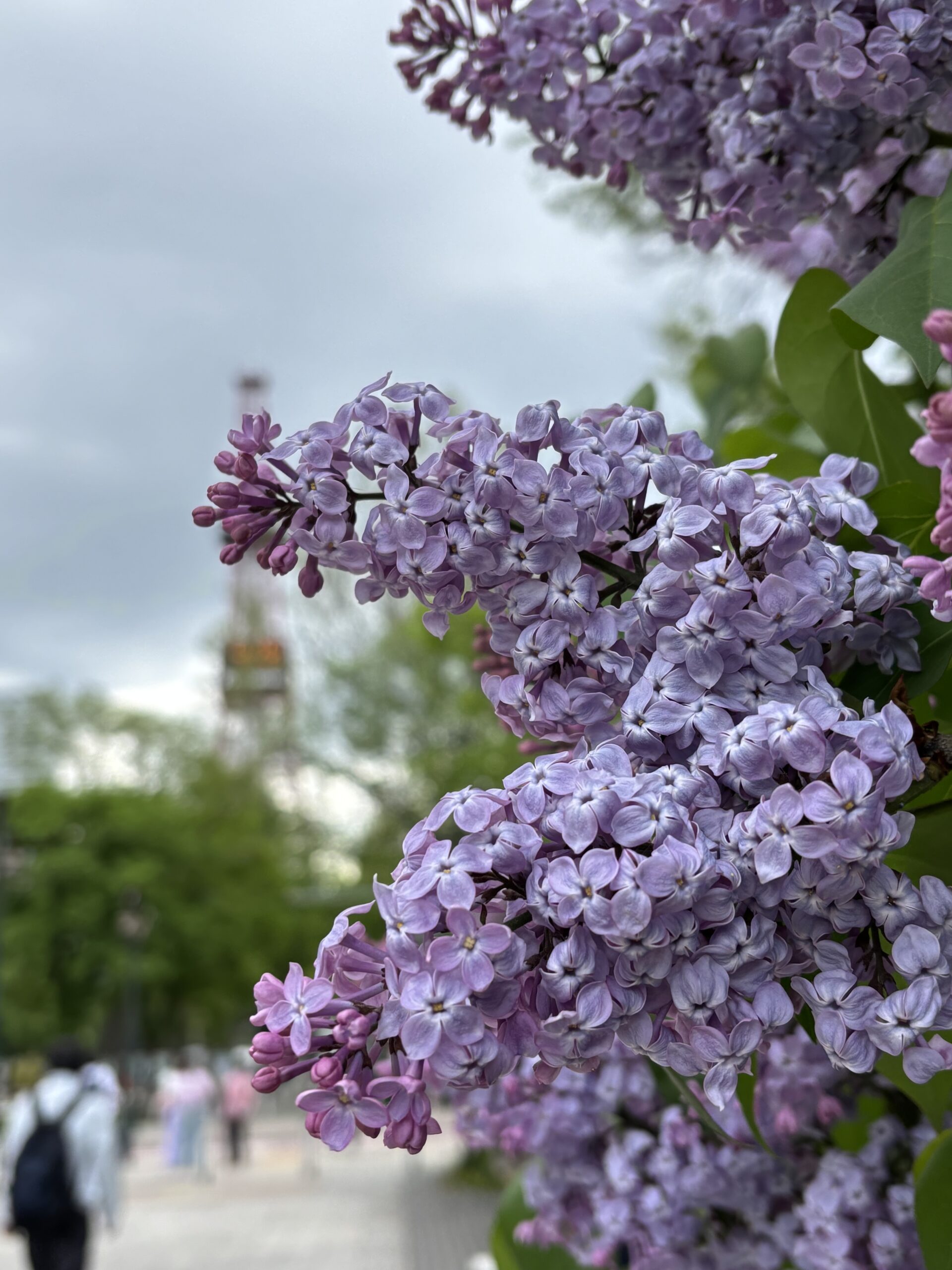 メッセージ:勢い良いライラックをテレビ塔をバックに納めたつもりが、元気な葉っぱが遮るユニークなアングルに。