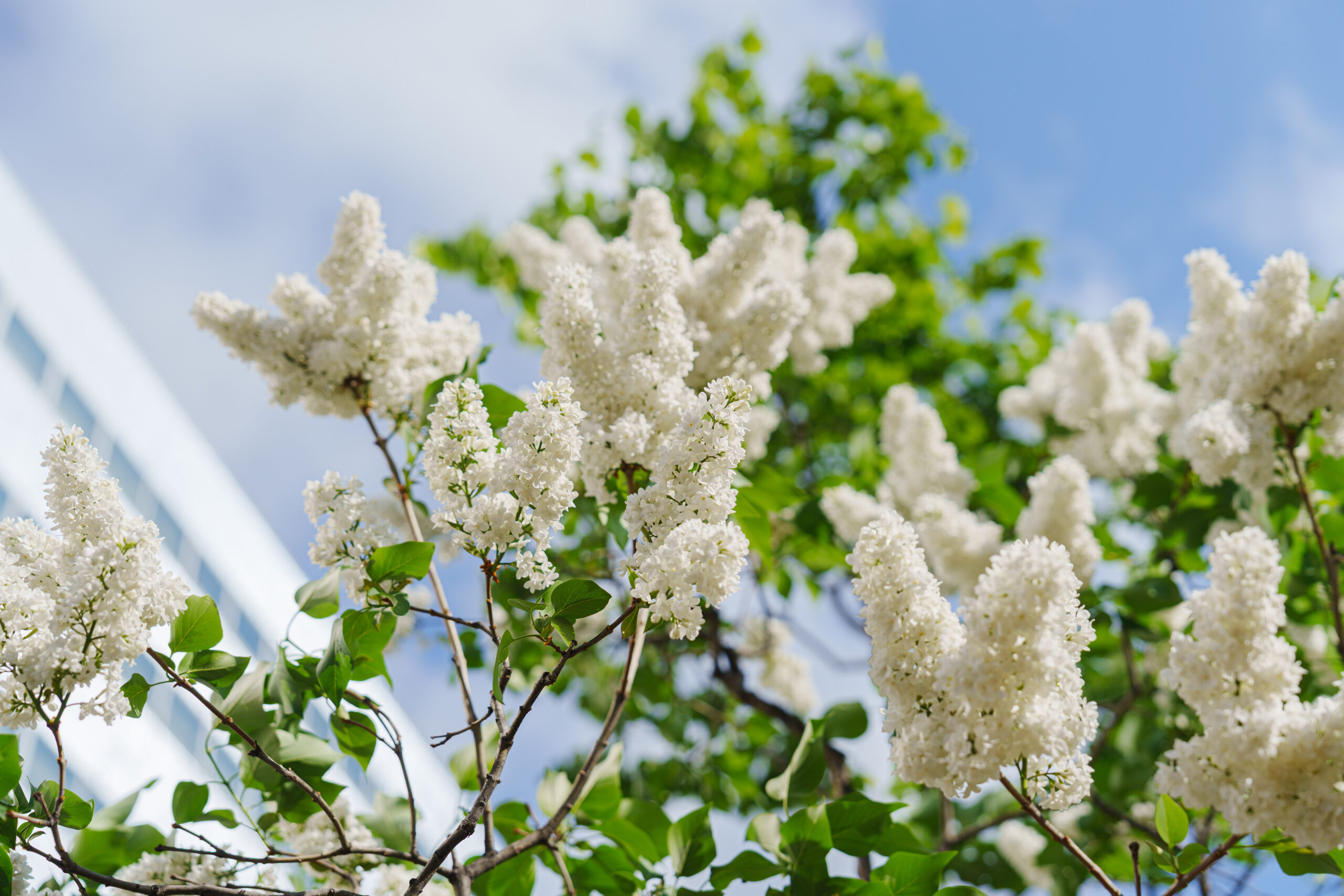メッセージ:白いライラックの花咲く木を、青空とともに撮影。