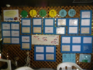 魚組は水辺の調査を始めて2年目ですが、観察した魚やエビなどを絵に描き、その紹介文が添えられています。子供たちの「この魚に一言!」が面白いです。