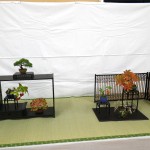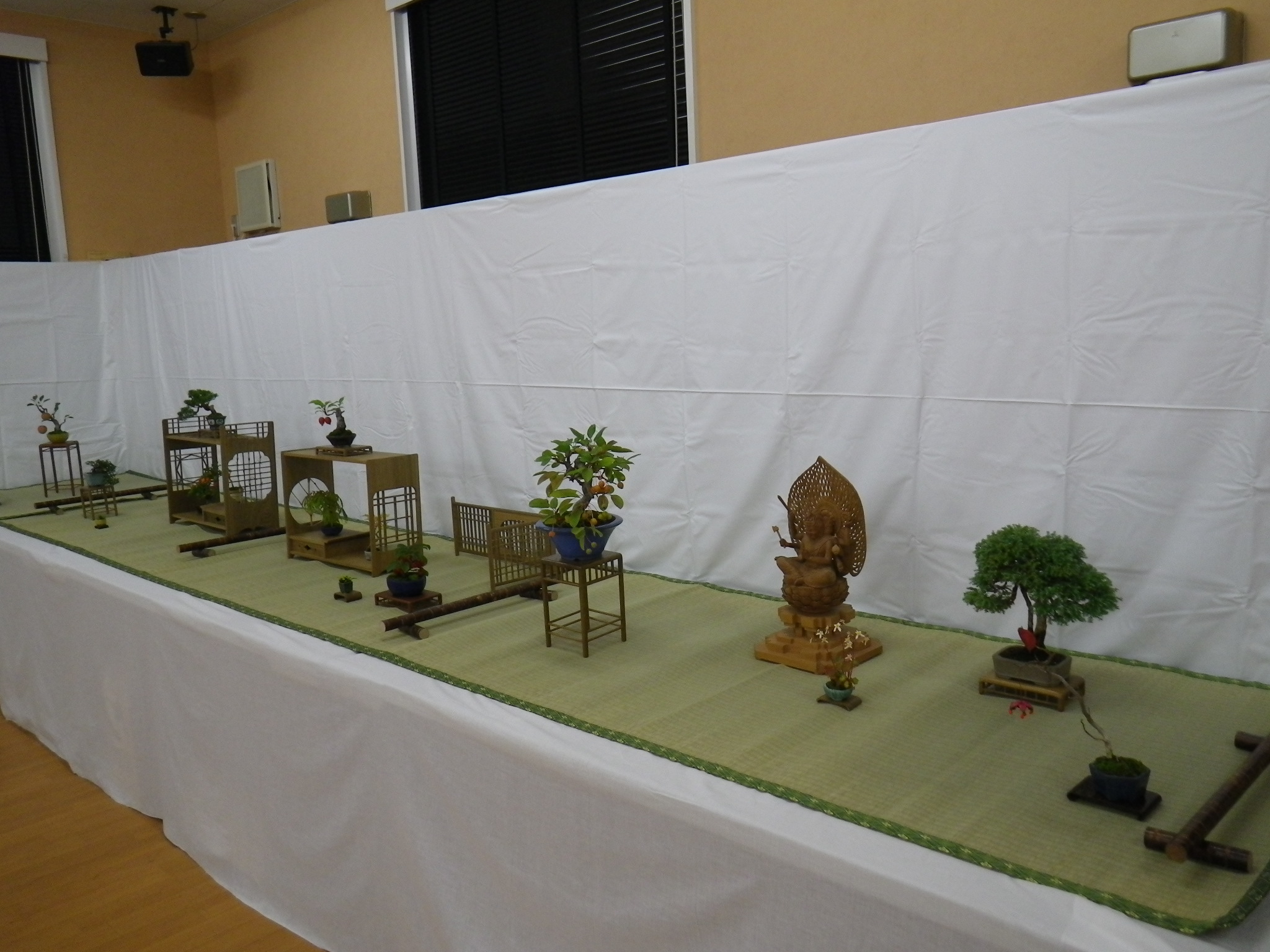 風流盆栽会の皆さんの丹精込めて育てた大小さまざまな盆栽が席飾りで展示されています。