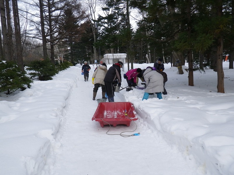 20日まで気温も低く、積雪も少ない豊平公園(豊平区はこの時点で一番積雪が少ないんじゃない?って皆さんから言われるほど)で、アイスボードなどは順調に準備できたのですが、設置する土台になる雪が足りるだろうか、固まるだろうか、と心配しながら21日はスタートしました。