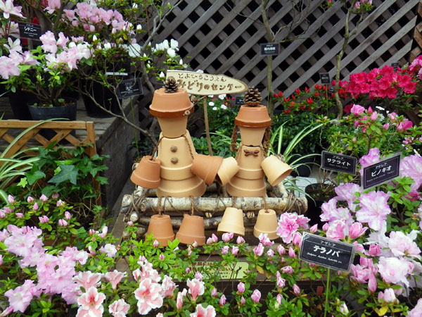 〈去年の展示。アザレアの花に囲まれたポット人形がかわいい〉