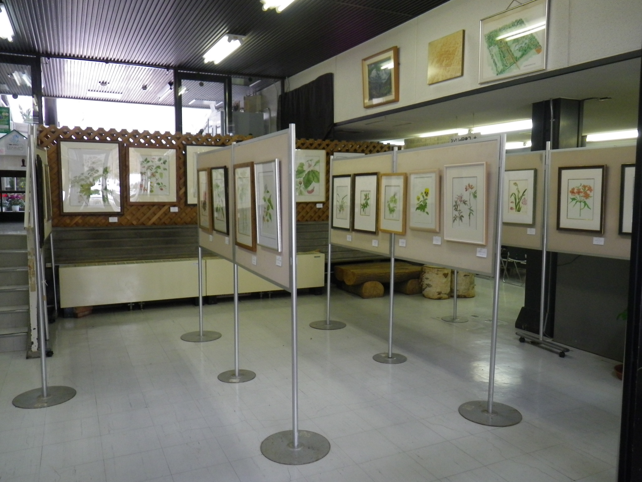 さて、展示会の作品は、講師の福澤レイ先生、さっぽろ植物画同好会の皆さんの作品です。一人一点の作品展示ですが、56点あります。