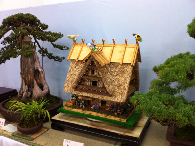 手作りの合掌造りのジオラマ。盆栽に合っていて良い雰囲気です。