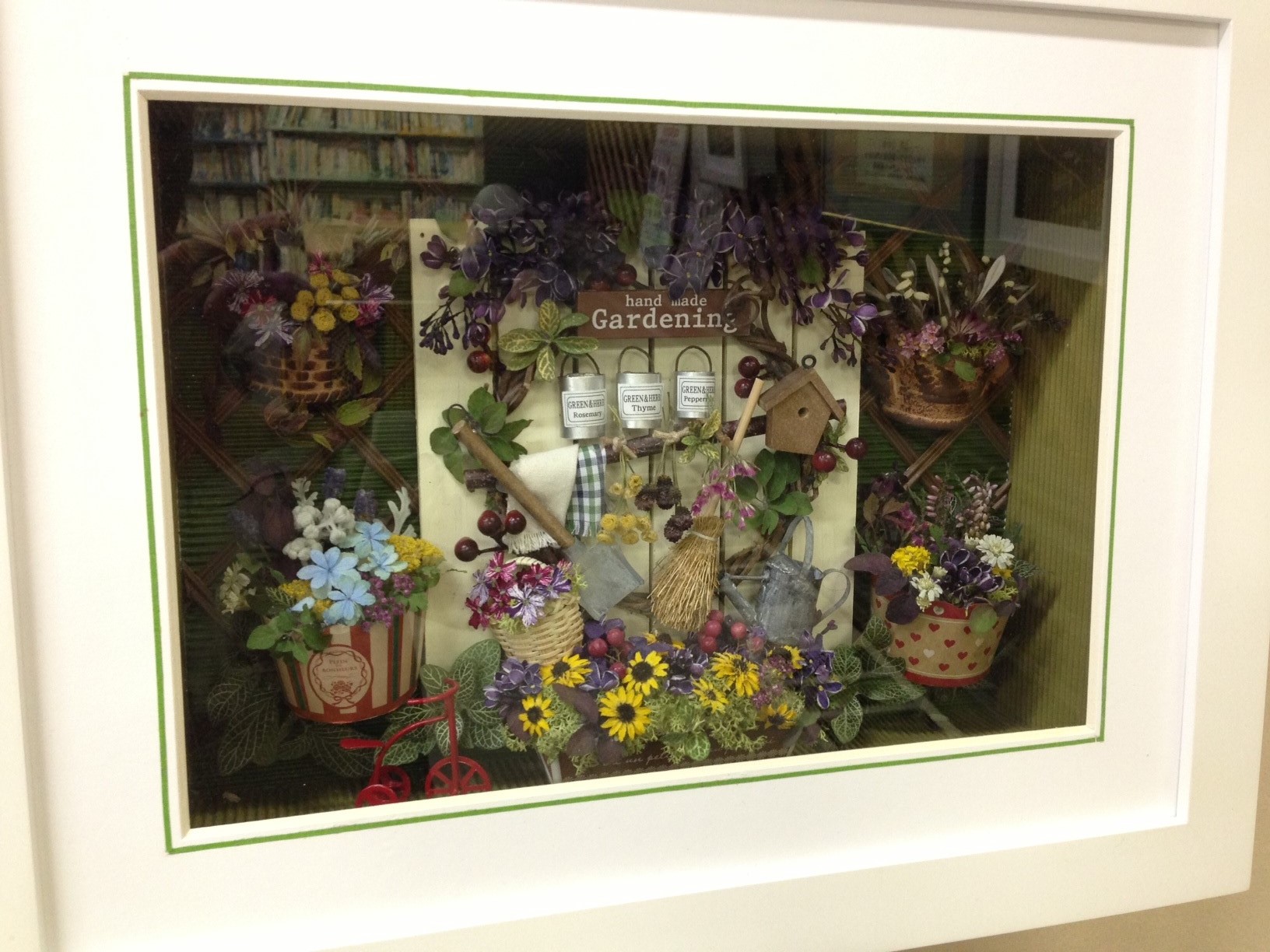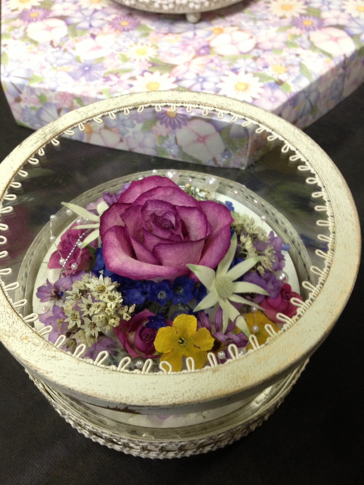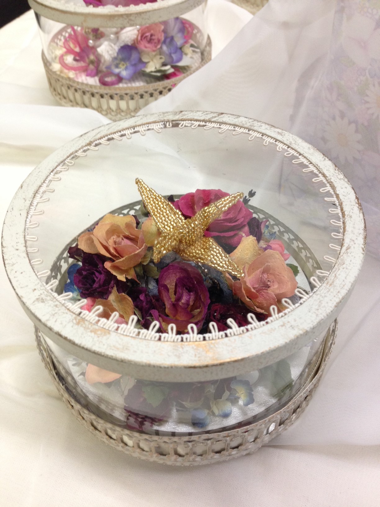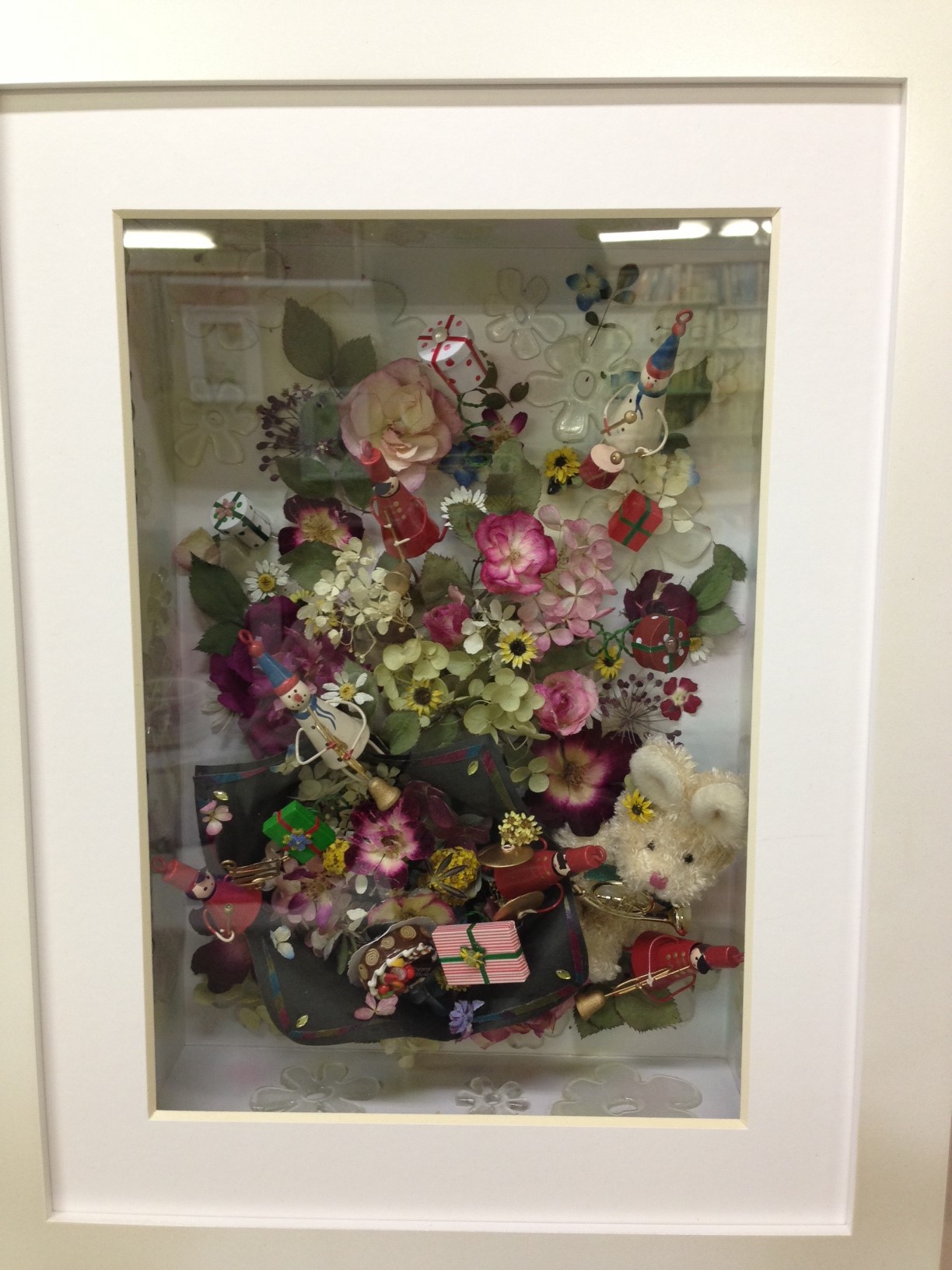 展示品の制作は押し花作家のたけだりょうさんと「フルールアール」会員の作品が並びます。