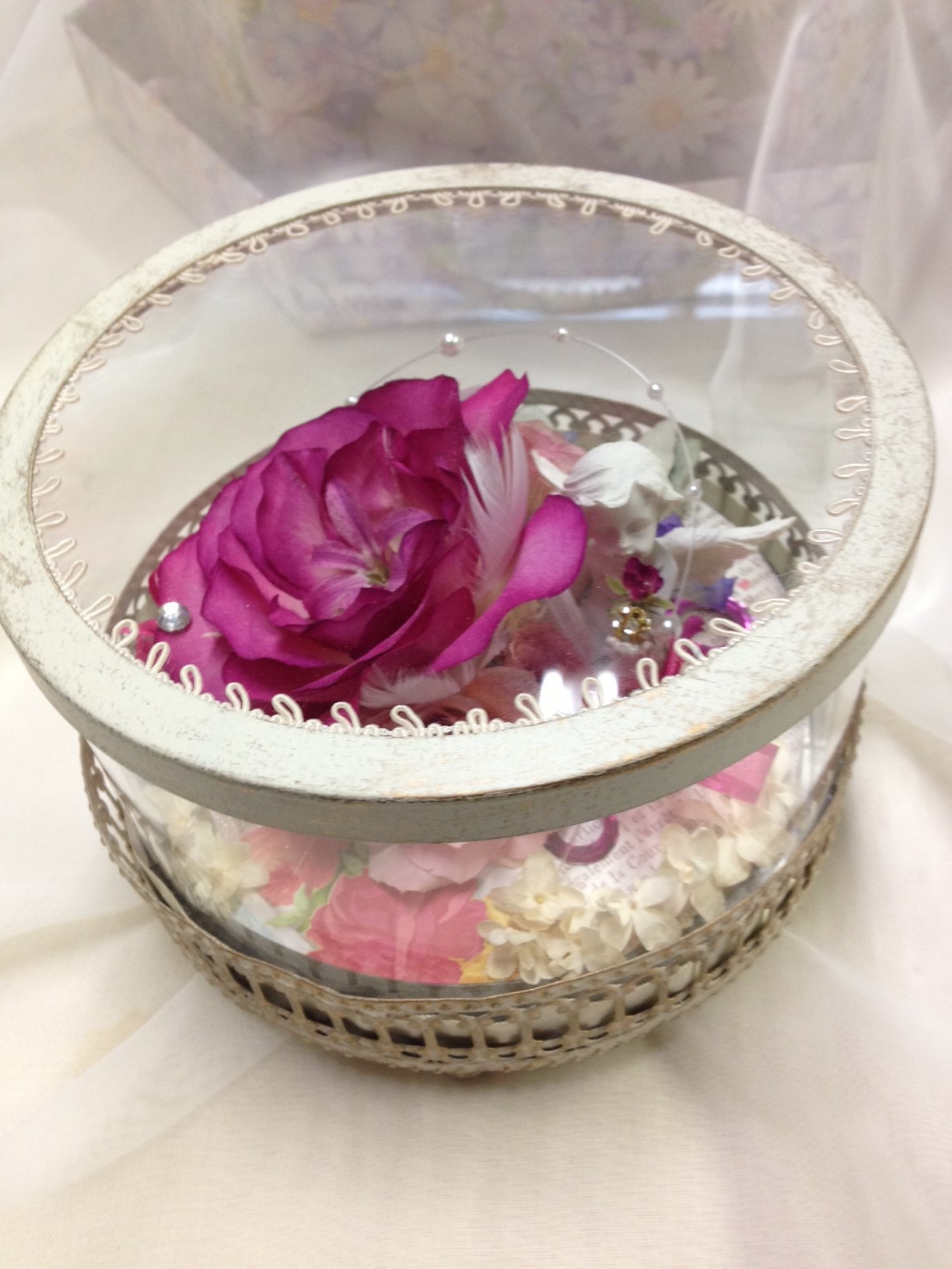円形の透明な容器内にデコレーションケーキのようにレカンフラワーをアレンジした、
