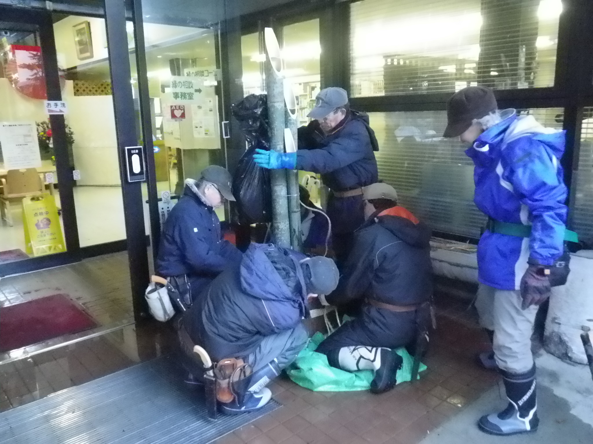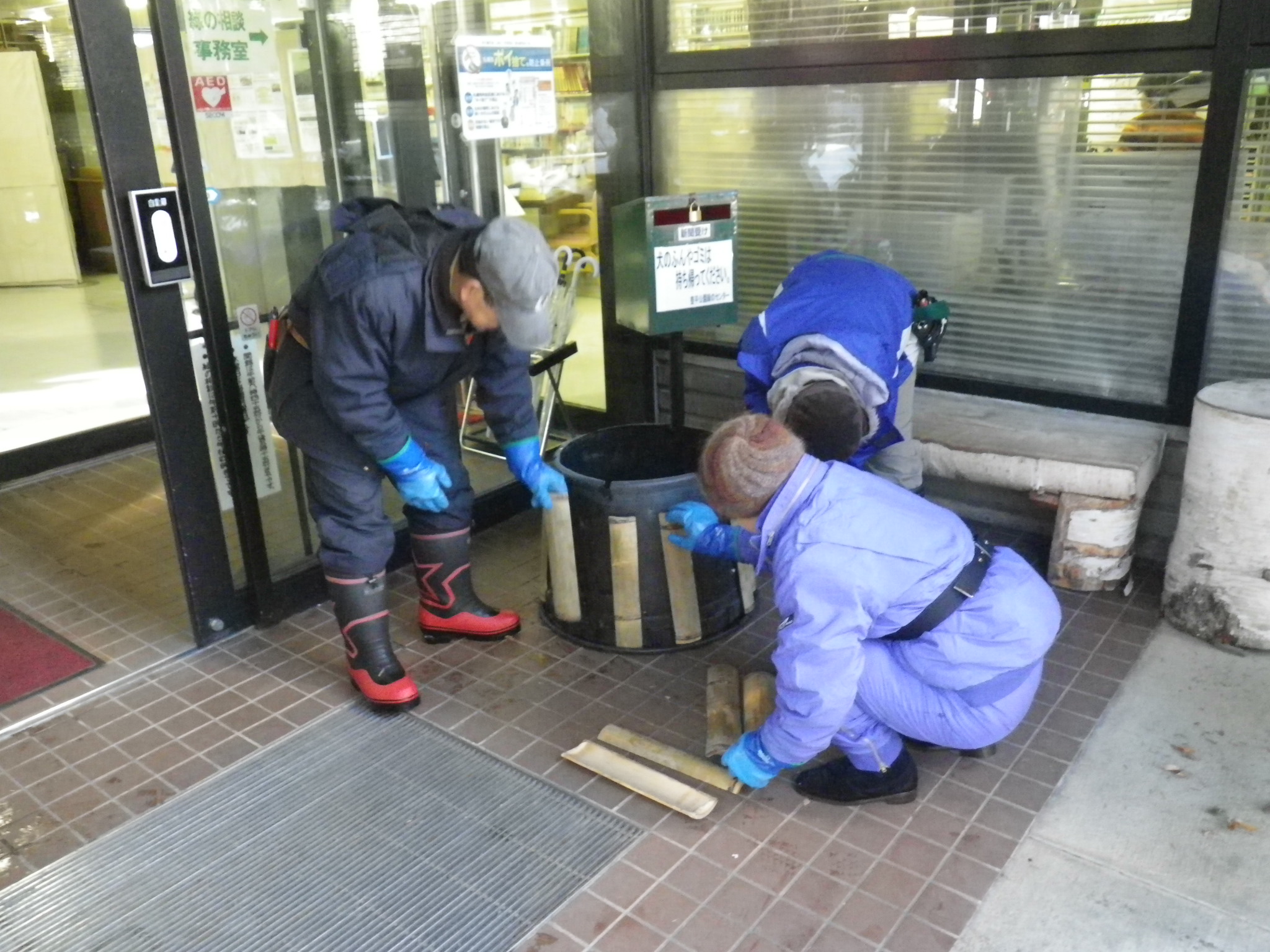 竹が動かないよう、支えながら雪を詰め込んでいるところです。