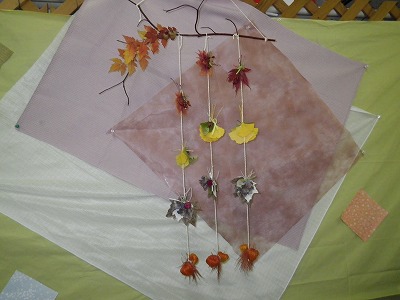 ←ヒッコリーで人形を、お花で冠、落ち葉で持ち物を作ってあります。