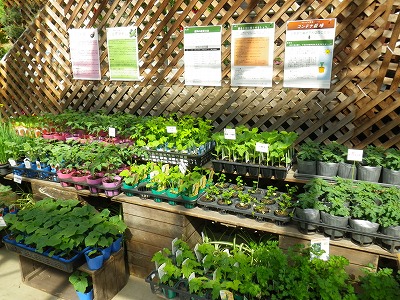 写真右はテラスの苗売場。トマトやシソ、ナスなどの外においても大丈夫な苗が並んでいます。