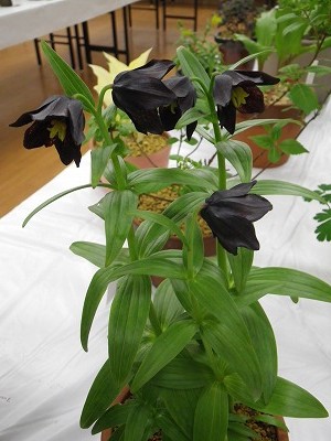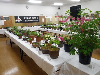 北海道山草会の皆さんが栽培している季節の山野草がずらり。