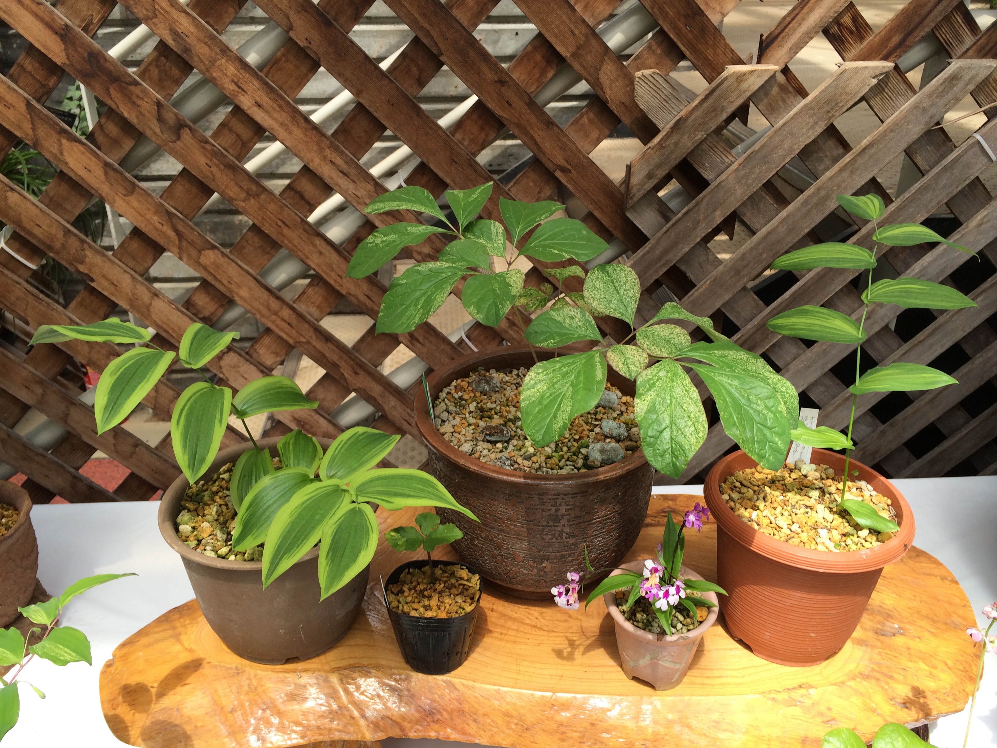 展示会では、ヤマシャクヤク、アマドコロなど約50鉢の斑入り植物が