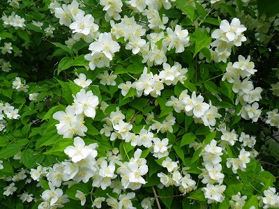 写真はバイカウツギ。噴水周りは何本か株がありますが、