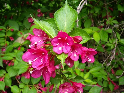 噴水のそばには↓真っ赤なベニウツギも咲いています。