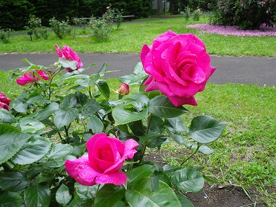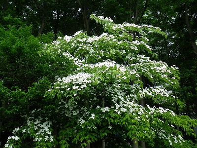 ↑花木園のヤマボウシ(写真左)が満開、バラも咲き始めました。
