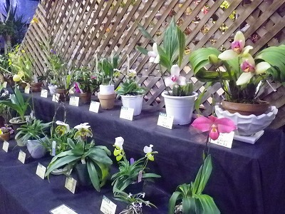 ↑中央にある白い花のリンコレリオカトレアが大賞(会長賞)、展示作品の一番、です。