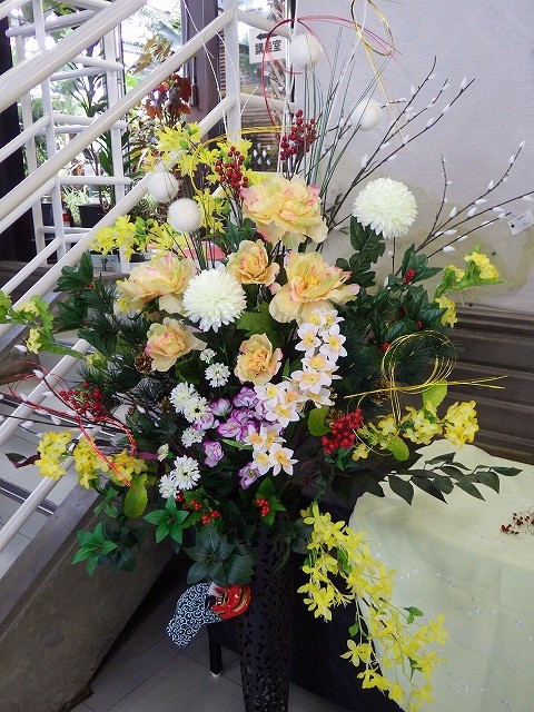 ↑今年も豪華な活け込み。相談員の書も飾ります。