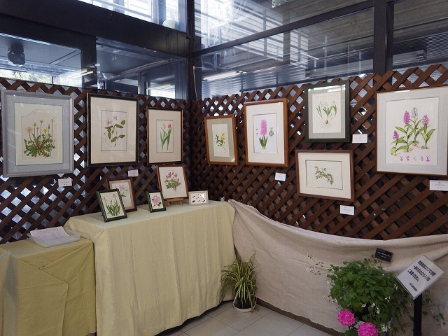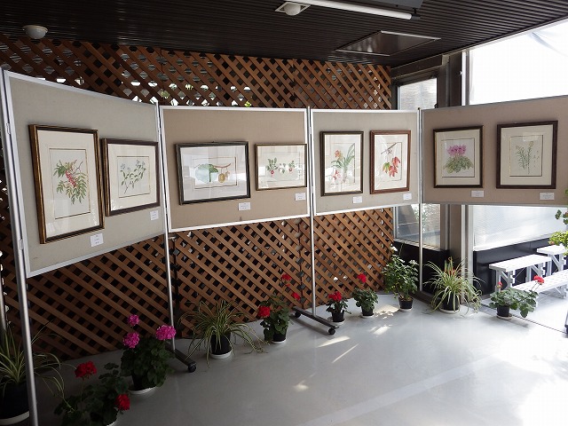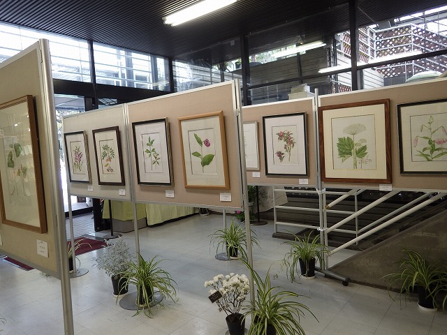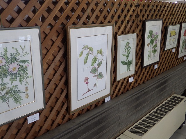 センターホールと中2階を会場に『さっぽろ植物画同好会』の皆さんの作品が並びます。