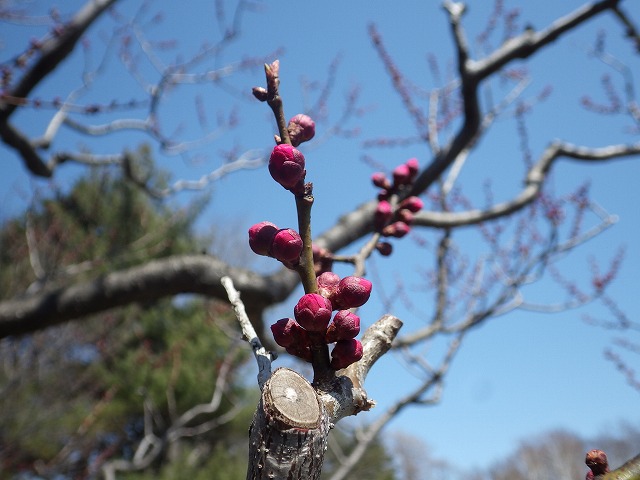 右上の写真は紅梅です。赤い蕾がかなり膨らんできました。