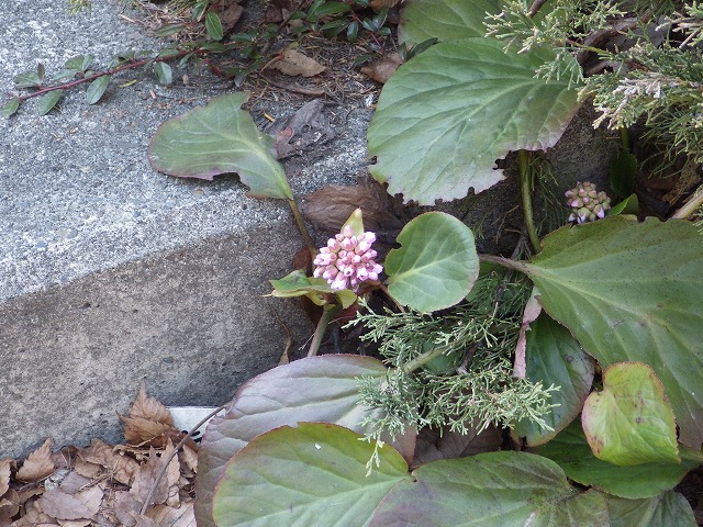 事務所の窓の下の園路脇にあるのはヒマラヤユキノシタ(写真右上)。