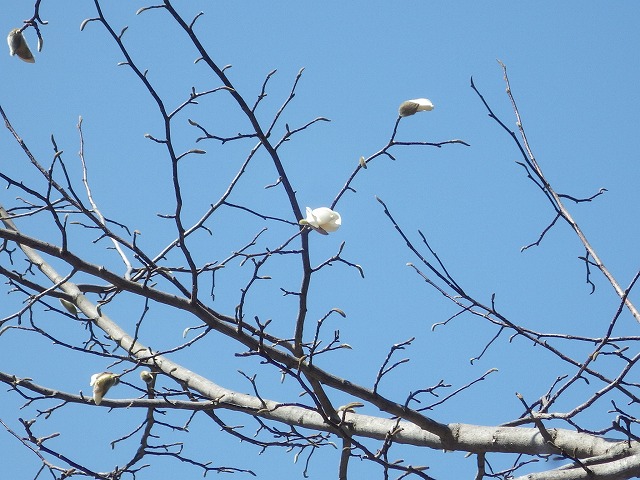 キタコブシの蕾が割れて、白い花弁が見えてきました(写真左下)。